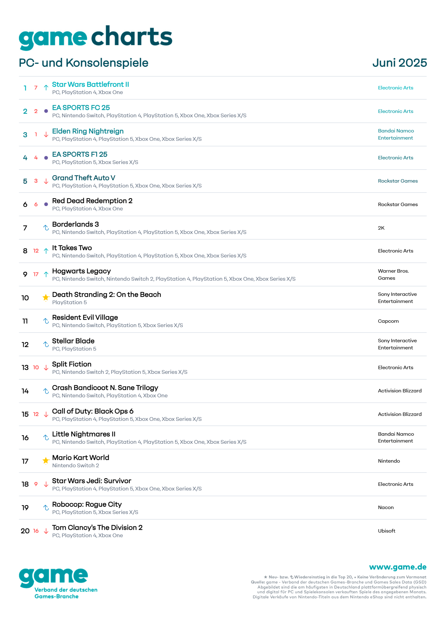 Zwei neue Titel schaffen es ebenfalls in die Charts: Das Action-Adventure "Death Stranding 2: On the Beach" (Sony Interactive Entertainment) landet auf dem zehnten Platz. Die Fortsetzung des gleichnamigen ersten Spiels erschien Ende Juni und verfolgt die Geschichte des Lieferboten Sam aus dem ersten Teil, der in einer postapokalyptischen Welt die Menschheit wieder näher zusammenbringen soll. Das Rennspiel voller bunter Strecken und Charaktere "Mario Kart World" (Nintendo), das zum Launch der neuen Nintendo Switch 2 veröffentlicht wurde, steigt auf Platz 17 ein.