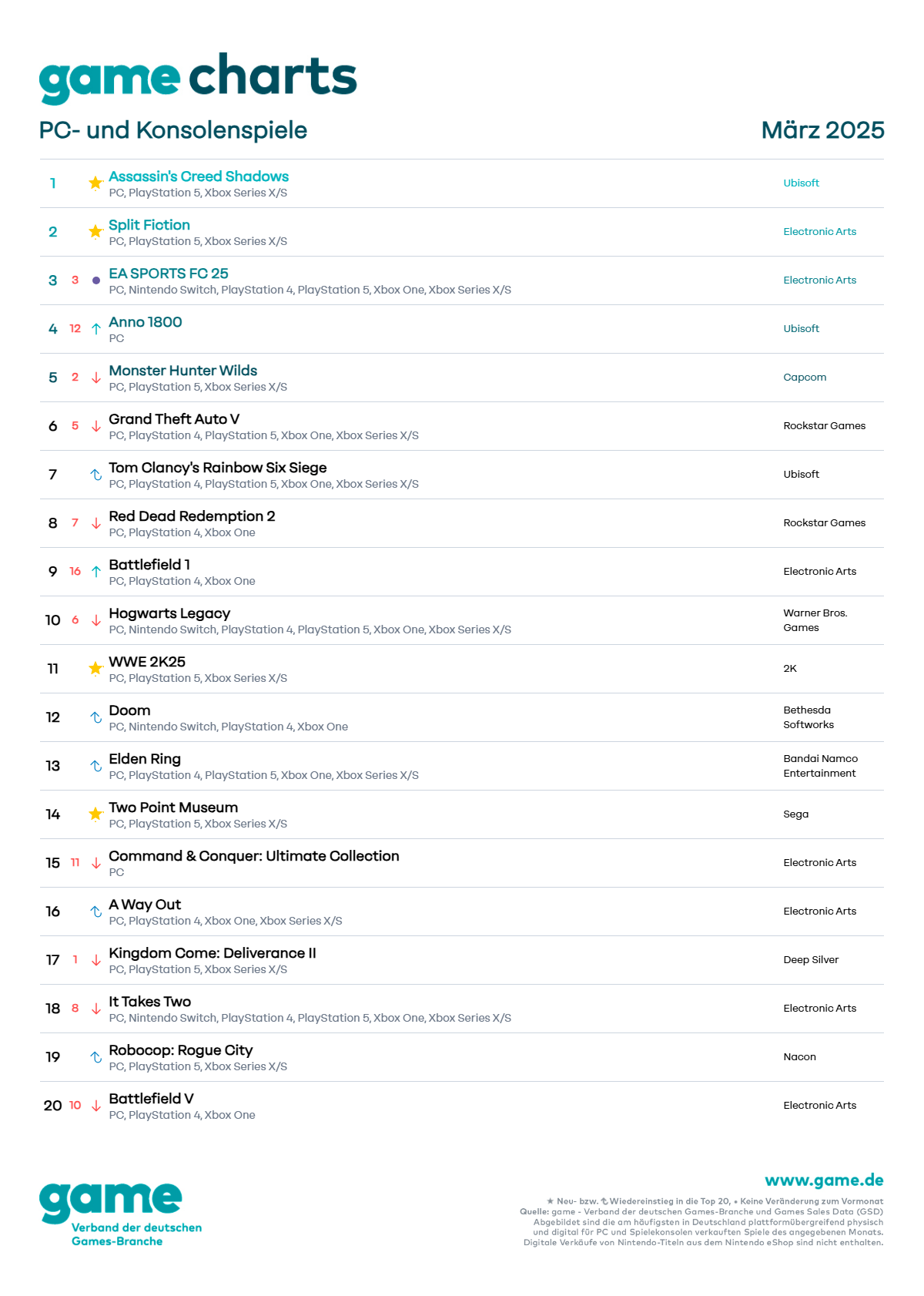 Im neuesten Titel der bekannten Spielereihe begeben sich Spielende als eine Shinobi-Assassinin oder ein Samurai auf ein episches Abenteuer im Japan des 16. Jahrhunderts. Das kooperative Multiplayer-Spiel "Split Fiction" (Electronic Arts) feiert ebenfalls einen Charts-Erfolg und landet auf dem zweiten Platz. Im Koop-Abenteuer tauchen Spielerinnen und Spieler gemeinsam in die fantasievollen Welten ein, die direkt der Gedankenwelt der beiden Hauptfiguren entspringen, und stellen sich gemeinsam actionreichen Herausforderungen. Die Top 3 der erfolgreichsten Spiele im März rundet die Fußball-Simulation "EA SPORTS FC 25" (Electronic Arts) ab. Außerdem neu in den Charts: das Wrestling-Spiel "WWE 2K25" (2K) auf dem elften Platz sowie die Museum-Simulation "Two Point Museum" (SEGA) auf Platz 14.