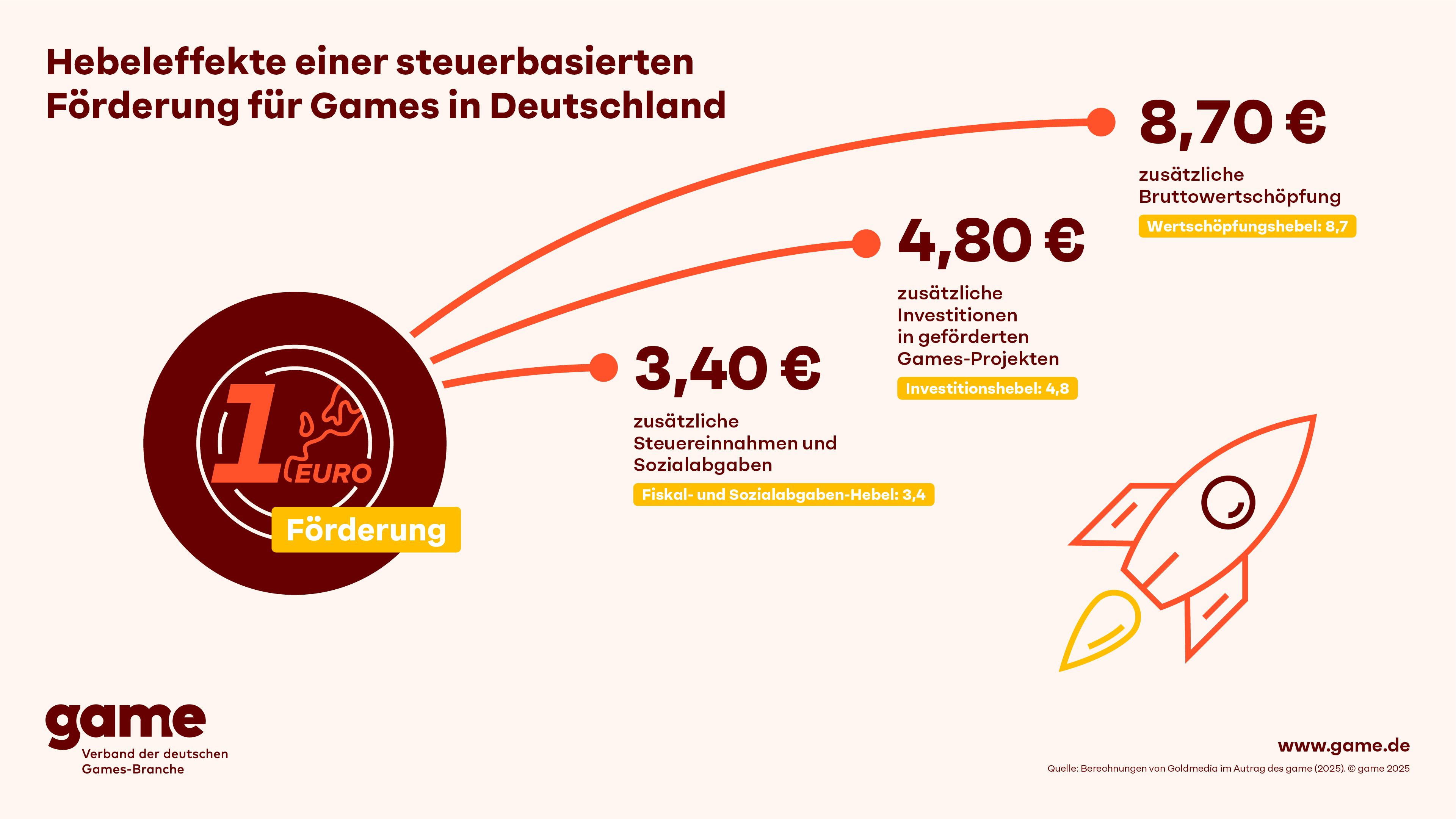 Um ein Level-Playing-Field im internationalen Vergleich zu schaffen, soll laut Konzept die steuerbasierte Games-Förderung mittels Steuergutschriften in Höhe von 30 Prozent beziehungsweise 35 Prozent für kleine und mittelständische Unternehmen eingeführt werden. Damit würden Investitionen, Steuereinnahmen und Wertschöpfung stark angeschoben werden. Das zeigt erstmals eine Analyse des Forschungs- und Beratungsunternehmens Goldmedia im Auftrag des game. Demnach würde jeder Euro Games-Förderung 4,80 Euro zusätzliche Investitionen auslösen, 3,40 Euro zusätzliche Steuereinnahmen und Sozialabgaben einbringen und 8,70 Euro Bruttowertschöpfung in Deutschland generieren. Bei dauerhafter Implementierung einer steuerlichen Förderung sei laut der Experten sogar von noch höheren Werten auszugehen, da Produktionskapazitäten ausgebaut, Ansiedlungen von Unternehmen aus dem Ausland angekurbelt und aus Deutschland heraus größere Spiele für den globalen Games-Markt entwickelt werden.