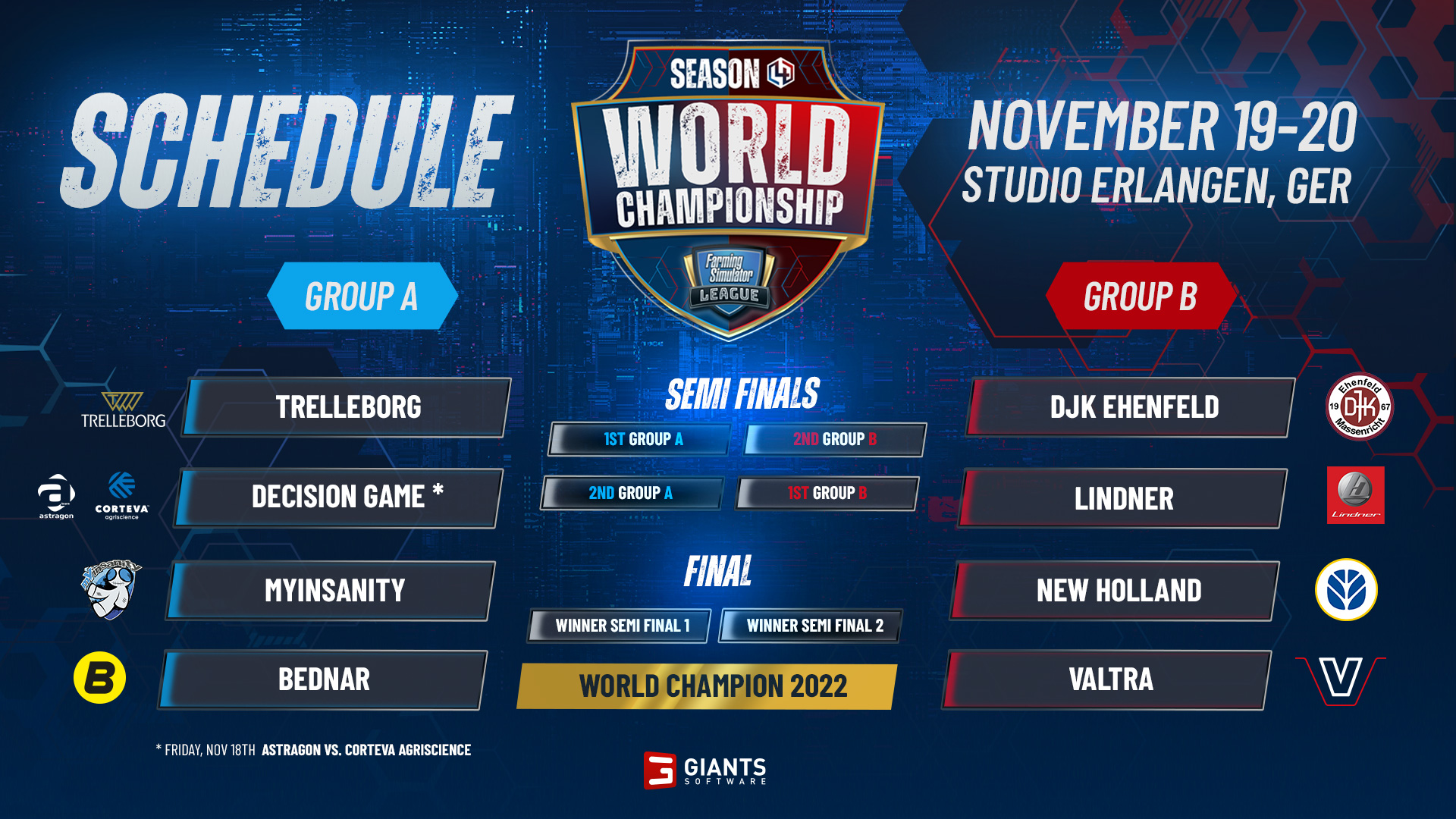 Das letzte Turnier vor dem Showdown findet ab Samstag in zwei Gruppen mit je einer oberen und unteren Gruppe für die acht teilnehmenden Mannschaften statt. Die Gruppensieger sind für das Halbfinale am Sonntag gesetzt, während sich die Zweitplatzierten über eine zweite Chance qualifizieren. Diese Turnierstruktur lässt eine Niederlage in der Gruppenphase zu, und verleiht den Teilnehmern eine weitere Chance auf das Halbfinale der Weltmeisterschaft. Am Sonntag krönt GIANTS Software den Sieger des Endspiels zum FSL-Weltmeister!