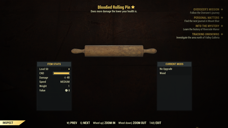 Im Boss befand sich nur ein legendäres Nudelholz, das nicht einmal überragende Werte mit sich bringt. Mit 48 Schaden im Nahkampf und der Fähigkeit, etwas mehr Schaden auszuteilen, ist dieses etwas mehr als durchschnittlich.