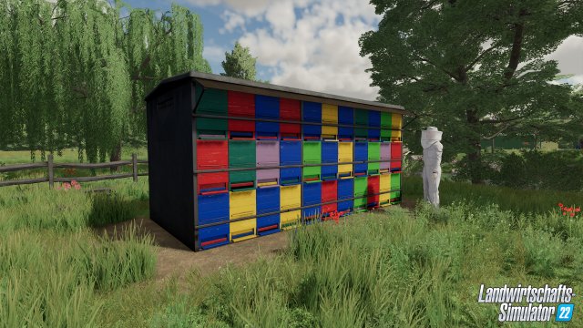 Die unbestreitbare Wichtigkeit von Bienen zeigt sich auch im Landwirtschafts-Simulator 22 durch verschiedene Effekte auf der Farm. Durch das Platzieren von Bienenstöcken in der Nähe von Feldern mit Raps, Kartoffeln und Sonnenblumen steigert sich dank der Bestäubung der Ertrag der gesäten Früchte. Und natürlich machen Bienen das, was sie am besten können: Eine süße, goldene und dickflüssige Substanz produzieren.