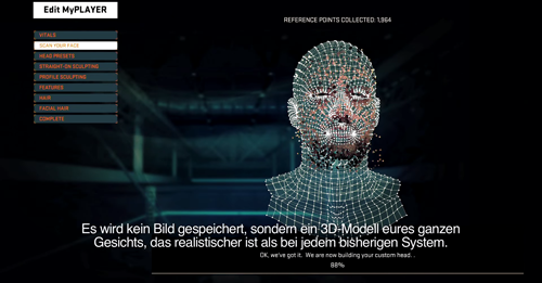 Ihr könnt vorab euer Gesicht scannen, damit ein 3D-Modell erstellt und dieser lässt sich wie ein ganz normaler Kopf dann auch bewegen. Zur Information: Mit diesen Scannen eures Gesichs, werden keine Fotos gespeichert, sonder es wird nur die Texture festgelegt. Dieses wird dann euren Kopf sehr ähnlich sehen.