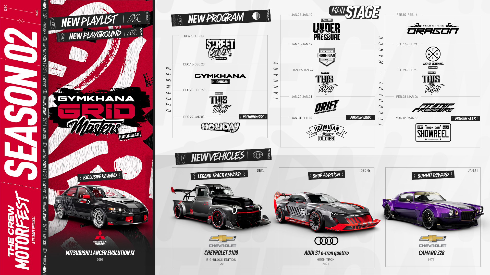 Die brandneue Gymkhana Grid Masters Playlist bietet das volle HOONIGAN-Erlebnis und ermöglicht es den Spielerinnen und Spielern, ihre Fahrkünste in extremen Situationen unter Beweis zu stellen. Die Drift Experience Playlist erhält ebenfalls ein Volume 2, das den ursprünglichen Inhalt verdoppelt und die Kunst des Verbrennens von Gummi zelebriert. Zusätzlich zu diesen Playlist-Updates können in den nächsten drei Monaten viele spezielle HOONIGAN-angepasste Fahrzeuge entdeckt werden, darunter der Ford Hoonicorn Mustang und der Audi S1 E-Tron Quattro Hoonitron, sowie viele weitere Überraschungen.
