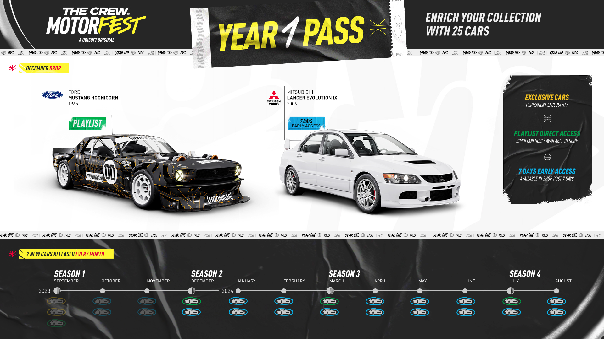 Alle Spielerinnen und Spieler haben kostenlosen Zugang zu allen Saison 2-Events. Besitzer:innen des Year 1 Passes erhalten vorübergehend exklusiven Zugang zu einigen der neuen HOONIGAN-Fahrzeuge, zusammen mit den anderen monatlichen Ergänzungen ihrer Sammlung. Der Year 1 Pass ist als Zusatz zum Basisspiel erhältlich oder direkt in den Gold- und Ultimate-Editionen enthalten.