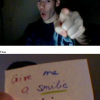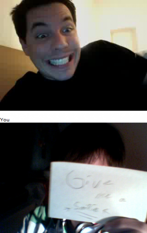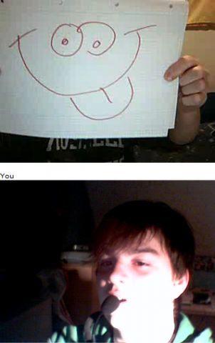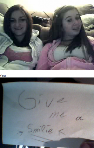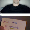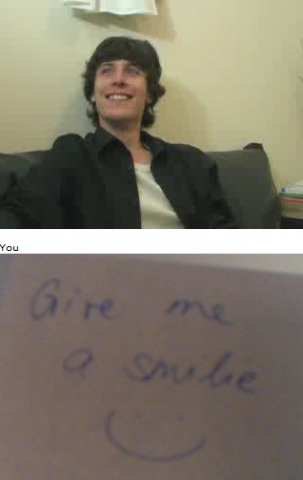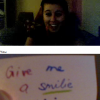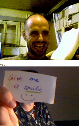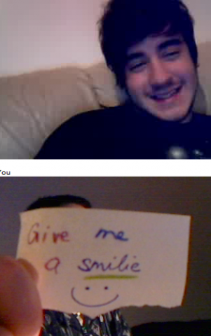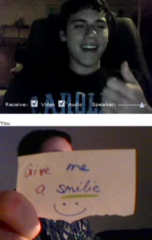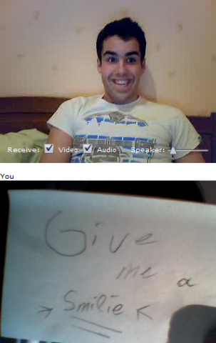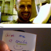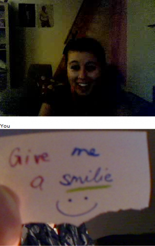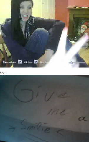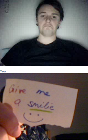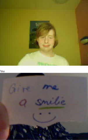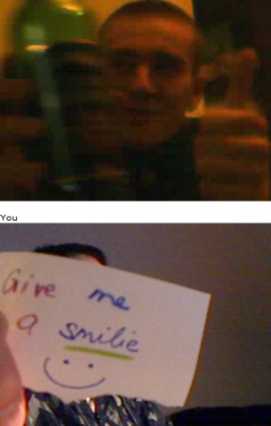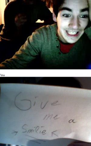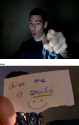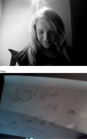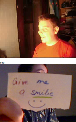 Ich und Eru hatten nach einen harten Tag ein wenig Spaß in Chatroulette nein nicht das was ihr denkt sondern, wir haben uns Zettel fertig gemacht wo „Give me a smilie“ oder ähnliches draufstand. Mit diesen Zetteln bewaffnet sind wir dann in Chatroulette gegangen und haben Smilie’s (Lächeln) gesammelt die schönsten/schrägsten/coolsten haben wir hier mal zusammengestellt.