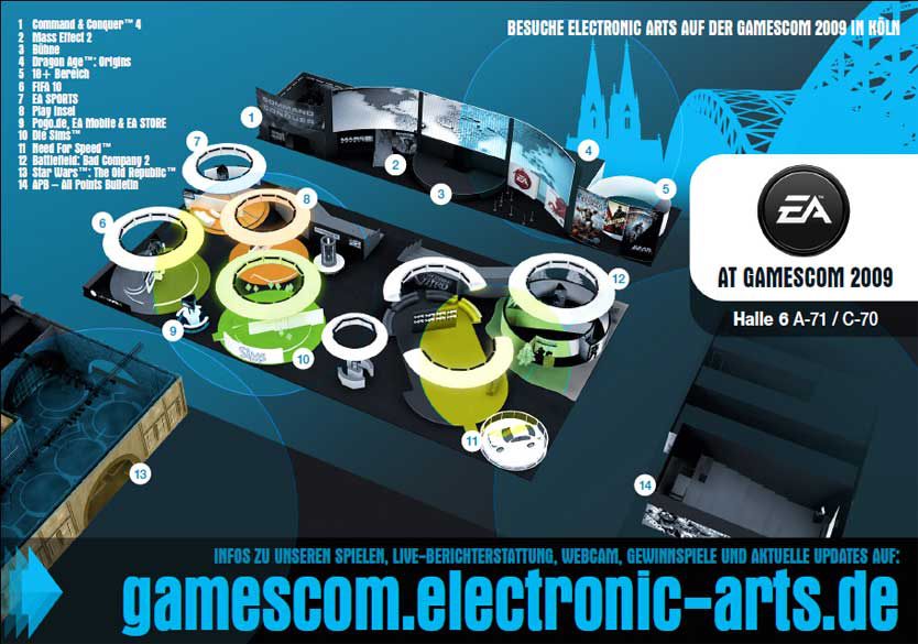August 2009 – Zeit für Games Convention – doch nicht dieses Jahr. EA beteiligt sich an der gamescom, die zum ersten Mal in Köln stattfindet – der Stand präsentiert sich im Ufo-Look.