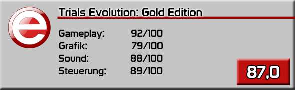 Trotz der eher mittelprächtigen Grafik und den zahlreichen Bugs, ist die Trials Evolution Gold Edition ein muss für jeden Rennspiel-Fan. Besonders die vielen Details und verrückten Ideen die im Spiel stecken sind einen Blick wert. Das Spielprinzip macht extrem süchtig und ich möchte, und kann nach den mittlerweile sechs Test-Stunden, den Controller nicht aus der Hand geben. Stichwort Controller: Dieser ist empfehlenswert, jedoch bleibt auch mit einer Tastatur der Spaß am Spiel nicht aus. Die Trials Evolution Gold Edition ist, und bleibt trotz ihrer Fehler, für mich ein ganz besonderes Spiel, welches ich bereits nach der ersten Spielstunde ins Herz geschlossen habe.
