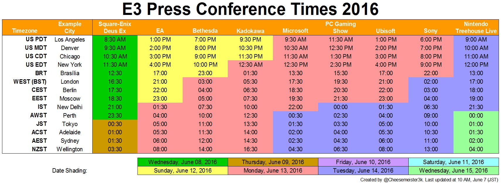 Die Electronic Entertainment Expo 2016 (kurz E3) steht bevor und wir wollen euch einmal die Termine wann welcher Publisher zu sehen ist vorstellen und euch natürlich auch Streams zur Verlinken, damit ihr die E3 in vollen Zügen genießen könnt.