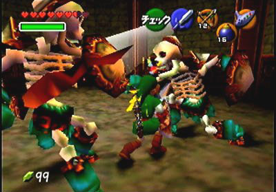 Eine weiterer positiver Faktor ist die simple und auch für Einsteiger geeignete Bedienung des Nintendo 64-Controllers: Der Analogstick wird zur Fortbewegung genutzt, Schwertschläge führt Link mit dem grünen B-Knopf aus, abrollen kann er sich mit dem blauen A-Knopf. Die drei untersten C-Knöpfe dienen der Anwendung von Items und Waffen, wie z.B. dem Bogen, dem Enterhaken und Bomben. Den obersten C-Knopf benutzt der Spieler, um mit der treuen kleinen Fee Navi zu sprechen, die ihm nützliche Tipps für das Vorankommen im Spiel gibt.
