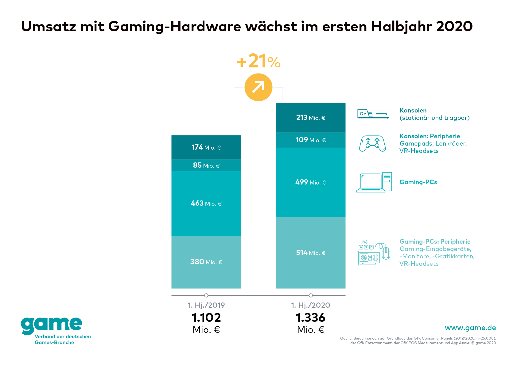 Innerhalb der starken Entwicklung des Gesamtmarktes ist auch der Umsatz mit Spiele-Hardware im ersten Halbjahr 2020 deutlich gestiegen. Wurden in den ersten sechs Monaten von 2019 noch rund 1,1 Milliarden Euro mit Gaming-PCs, Spielekonsolen und entsprechendem Zubehör umgesetzt, waren es im gleichen Zeitraum dieses Jahres bereits 1,3 Milliarden Euro. Das ist ein Zuwachs von 21 Prozent. Dabei konnten alle vier Teilmärkte zulegen. Besonders stark ist der Umsatz mit Peripherie für Gaming-PCs gewachsen. Hierzu gehören unter anderem Gaming-Eingabegeräte wie spezielle Mäuse und Tastaturen sowie auf die Bedürfnisse von Gamern zugeschnittene Monitore und Grafikkarten sowie Virtual-Reality-Headsets.
