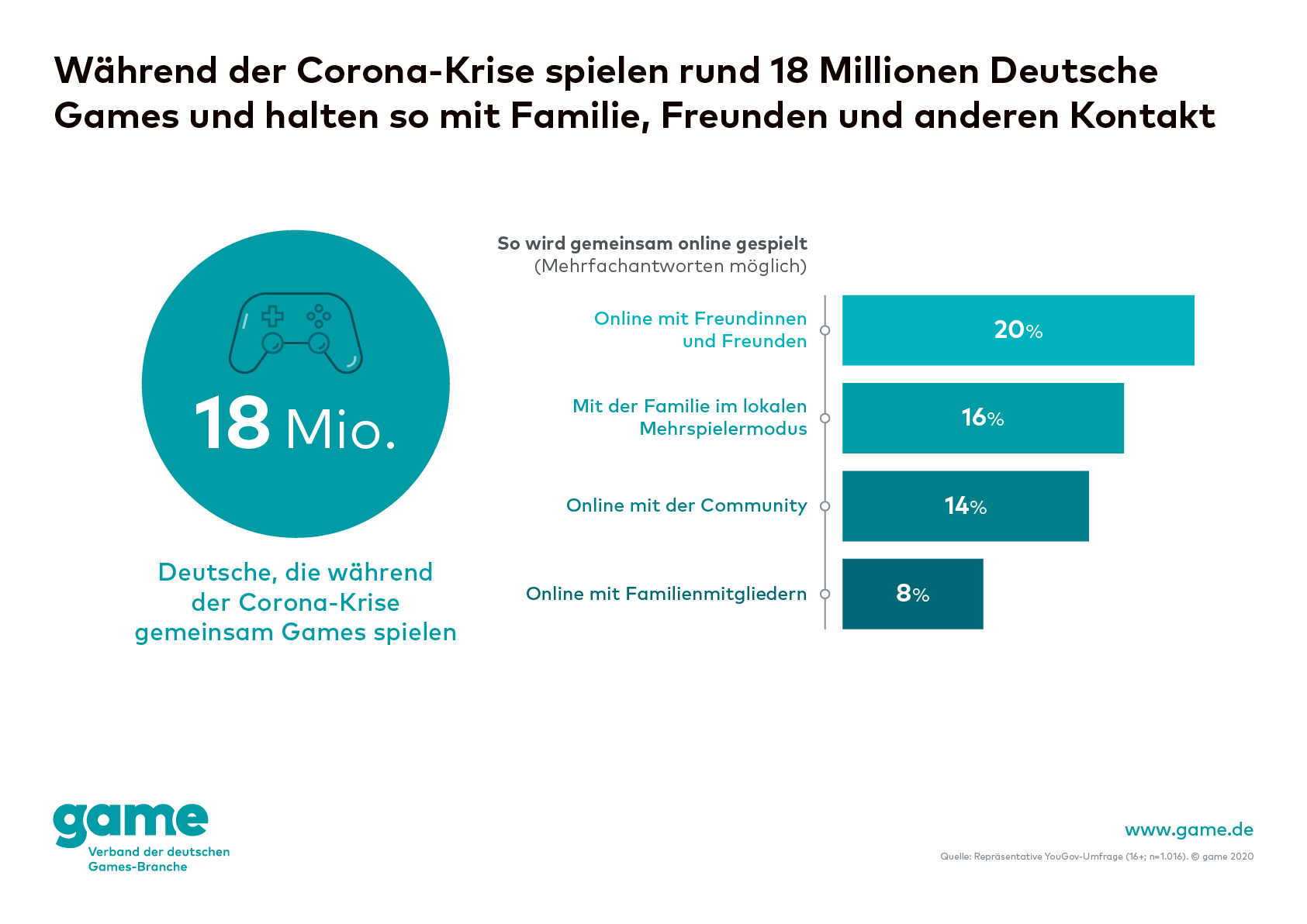 Die Corona-Kriese zwingt uns dazu, in den eigenen vier Wänden zu bleiben. Um trotz der Ausgangsbeschränkungen und Schutzmaßnahmen den Kontakt zu Familie, Freunden und anderen zu halten, greifen 18 Millionen Deutsche zu Controller, Tastatur und Co. Über das gemeinsame Spielen bleiben sie gerade auch in der aktuellen Phase miteinander verbunden.