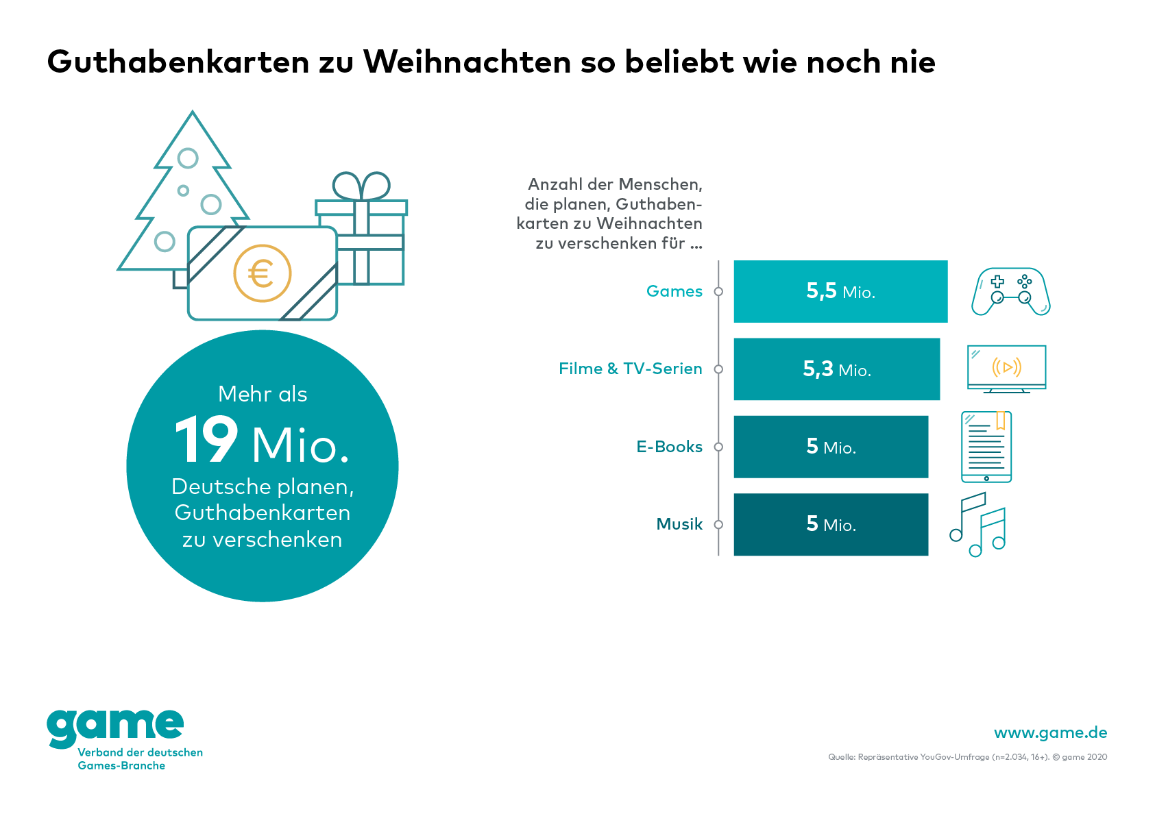In diesem Jahr kommt hinzu: Durch den Lockdown kurz vor Weihnachten sind die Guthabenkarten noch attraktiver geworden. Sie lassen sich häufig auch online kaufen und können nach der Bescherung direkt und auch digital eingelöst werden. Während 2019 noch 8,5 Millionen Deutsche planten, Guthabenkarten zu Weihnachten zu verschenken, sind es in diesem Jahr mehr als 19 Millionen Menschen und damit mehr als doppelt so viele. Das gab heute der game – Verband der deutschen Games-Branche auf Basis einer repräsentativen Umfrage des Meinungsforschungsinstituts YouGov bekannt. Danach sind Games die beliebteste Kategorie bei den Guthabenkarten: Insgesamt planen mehr als 5,5 Millionen Menschen, Games-Guthaben zu diesem Weihnachtsfest zu verschenken. Eine deutliche Steigerung zum Vorjahr: 2019 waren es noch etwas mehr als 3,5 Millionen Menschen. Auf Platz zwei folgen Guthabenkarten für Filme beziehungsweise TV-Serien, die 5,3 Millionen Menschen planen zu verschenken. Platz drei nimmt hauchdünn Guthaben für E-Books (5 Millionen Menschen) noch vor Musik (5 Millionen Menschen) ein.