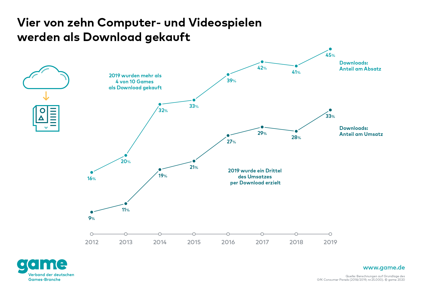 Rund 45 Prozent der hierzulande für PC, Konsole und Handheld im vergangenen Jahr gekauften Spiele wurden als Download bezogen. Im Vergleich zu 2018 entspricht das einer Steigerung um vier Prozentpunkte (41 Prozent). Darüber hinaus hat sich neben dem Absatz auch der Umsatz mit Downloads positiv entwickelt: Wurden 2018 noch etwa 28 Prozent des Umsatzes mit Spielen für PC, Spielekonsolen und Handhelds in Deutschland durch Download-Käufe generiert, waren es 2019 bereits 33 Prozent. Spiele-Apps, die ausschließlich als Download bezogen werden können, sind hierin nicht enthalten.