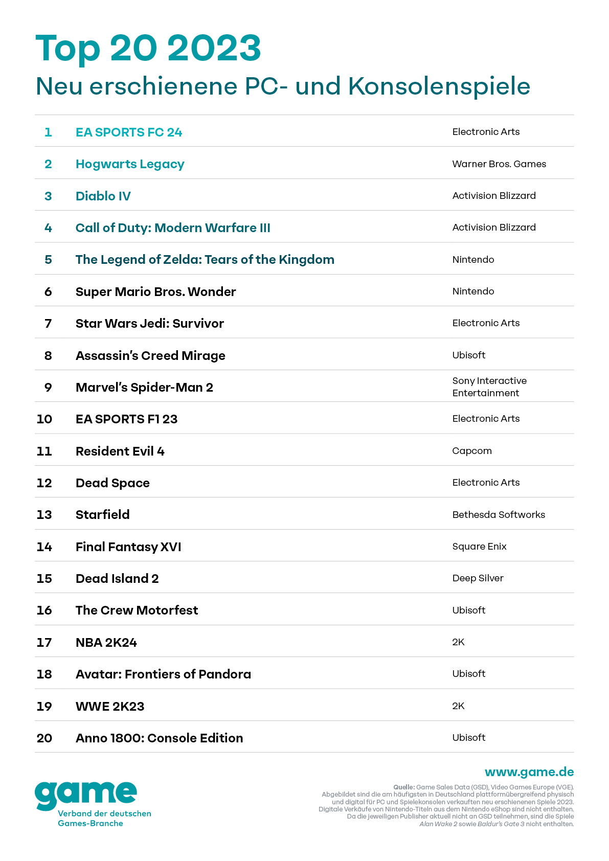 Die Jahrescharts führt die Fußballsimulation "EA SPORTS FC 24" (Electronic Arts) an, die 2023 zum ersten Mal unter dem neuen Titel der Spielereihe erschien und es seit ihres Release im September regelmäßig in die Top 3 der deutschen Monatscharts schaffte. Den zweiten Platz erobert das magische Open-World-Spiel "Hogwarts Legacy" (Warner Bros. Games) aus dem "Harry Potter"-Universum. Auf dem dritten Platz folgt die lang erwartete Fortsetzung der gleichnamigen RPG-Reihe – "Diablo IV" (Activision Blizzard). Platz 4 – nur zwei Monate nach seiner Veröffentlichung im November – sichert sich der actiongeladene First-Person-Shooter "Call of Duty: Modern Warfare III" (Activision Blizzard). Auf dem fünften Platz einen Erfolg feiert auch das Action-Adventure "The Legend of Zelda: Tears of the Kingdom" (Nintendo), das die Story der bekannten Protagonisten Link und Prinzessin Zelda weitererzählt. Auch eine Entwicklung aus Deutschland schafft es in diesem Jahr wieder in die Charts: die gesondert entwickelte Konsolenversion des Aufbaustrategiespiels „Anno 1800: Console Edition“ (Ubisoft), die 2023 für das Spielerlebnis auf der Konsole überarbeitet wurde.