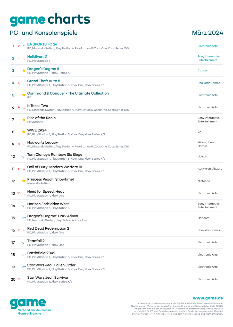 Vier Neuerscheinungen schaffen es im März in die offiziellen game Charts der erfolgreichsten PC- und Konsolenspiele in Deutschland: Das Action-Rollenspiel "Dragon’s Dogma II" (Capcom), das Ende März erschien, erobert gleich den dritten Platz. In den Top 10 landet das kampfbasierte Open-World-Rollenspiel "Rise of the Ronin" (Sony Interactive Entertainment) auf dem siebten Platz, gefolgt vom neuen Titel aus dem WWE-2K-Universums, dem Wrestling-Spiel "WWE 2K24" (2K) auf Platz 8.