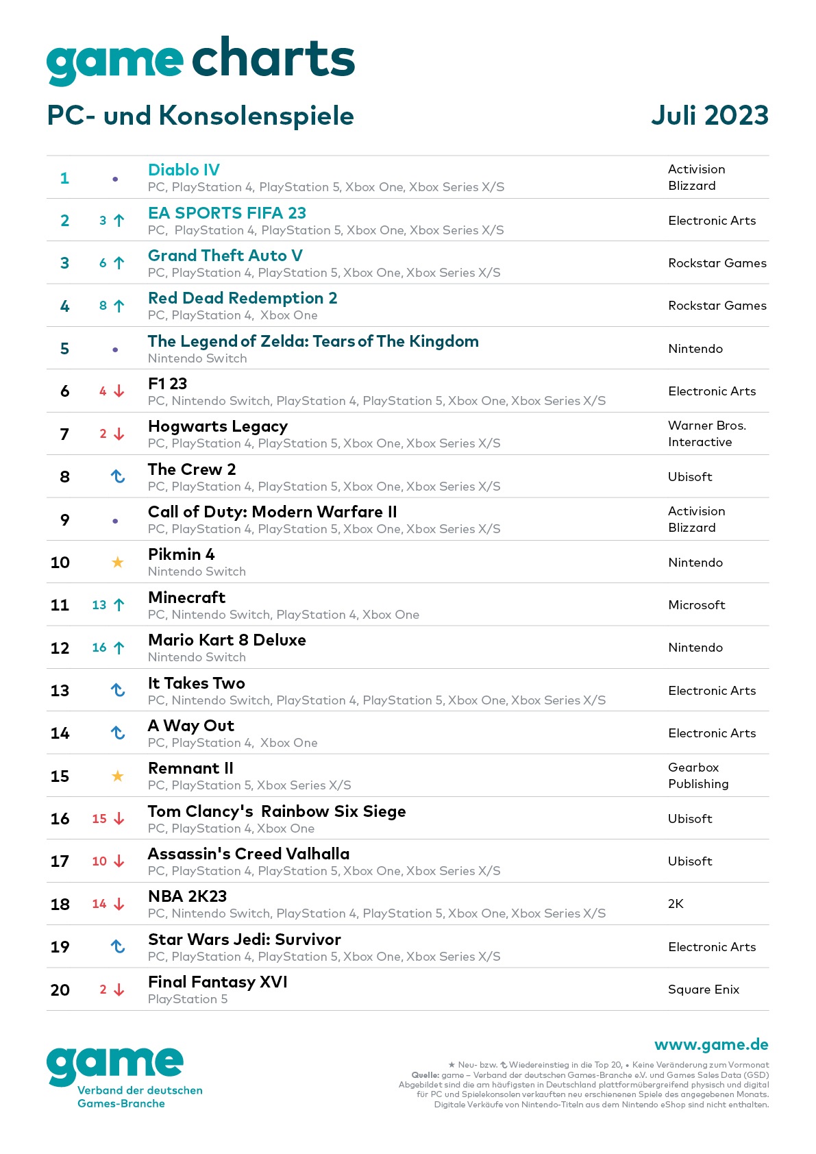 Top 20 der meistgekauften PC- und Konsolenspiele im Juli 2023 in Deutschland: