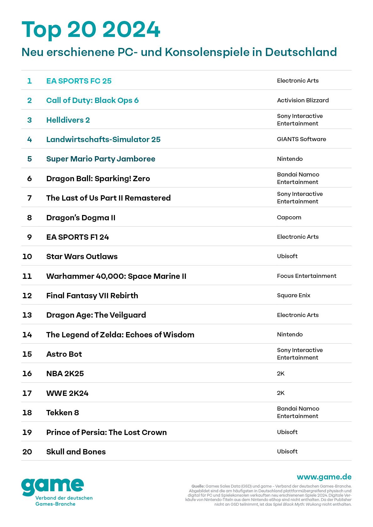 Top 20 der als Download und auf Datenträgern meistgekauften PC- und Konsolenspiele in Deutschland, die im Jahr 2024 erschienen:
