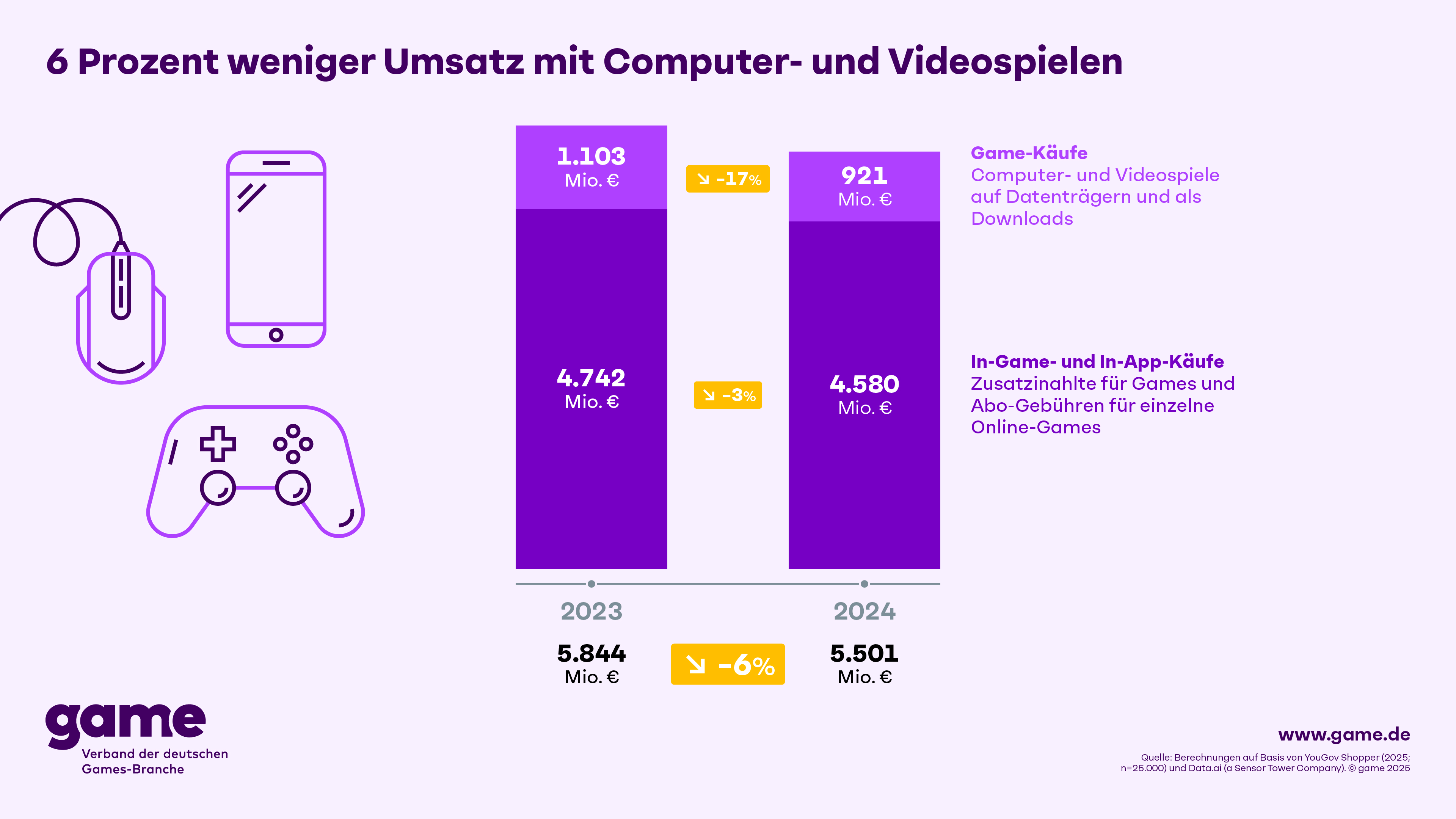 Der Umsatz mit Spielen für PC, Konsole und Mobilgeräte lag 2024 bei insgesamt 6,5 Milliarden Euro. Das sind 4 Prozent weniger als im Vorjahr. Besonders stark fiel der Rückgang beim Kauf von Spielen aus. Hier ging der Umsatz um 17 Prozent auf 921 Millionen Euro zurück. Mit In-Game- und In-App-Käufen wurden 2024 in Deutschland rund 4,6 Milliarden Euro umgesetzt. Dieses Marktsegment verzeichnete einen Rückgang um lediglich 3 Prozent. Der Teilmarkt für In-Game- und In-App-Käufe ist in den vergangenen Jahren stark gewachsen. Ob kostenfreier Free-to-Play-Titel oder Vollpreisspiel: Immer mehr Spiele bieten zusätzliche Inhalte an. Das Angebot ist dabei sehr unterschiedlich und reicht von sogenannten Skins, die das Aussehen der eigenen Spielfigur komplett verändern können, über Season Passes, die über mehrere Wochen Inhalte zum Freispielen anbieten, bis hin zu kompletten Erweiterungen mit neuen Kampagnen oder Missionen. In-Game-Käufe erlauben es den Spielerinnen und Spielern ihr Spielerlebnis zu individualisieren oder zu erweitern; aus Sicht der Unternehmen sind In-Game-Käufe eine wichtige Einnahmequelle, auch um das wirtschaftliche Risiko durch die in den vergangenen Jahren stark gestiegenen Entwicklungskosten zu verringern.
