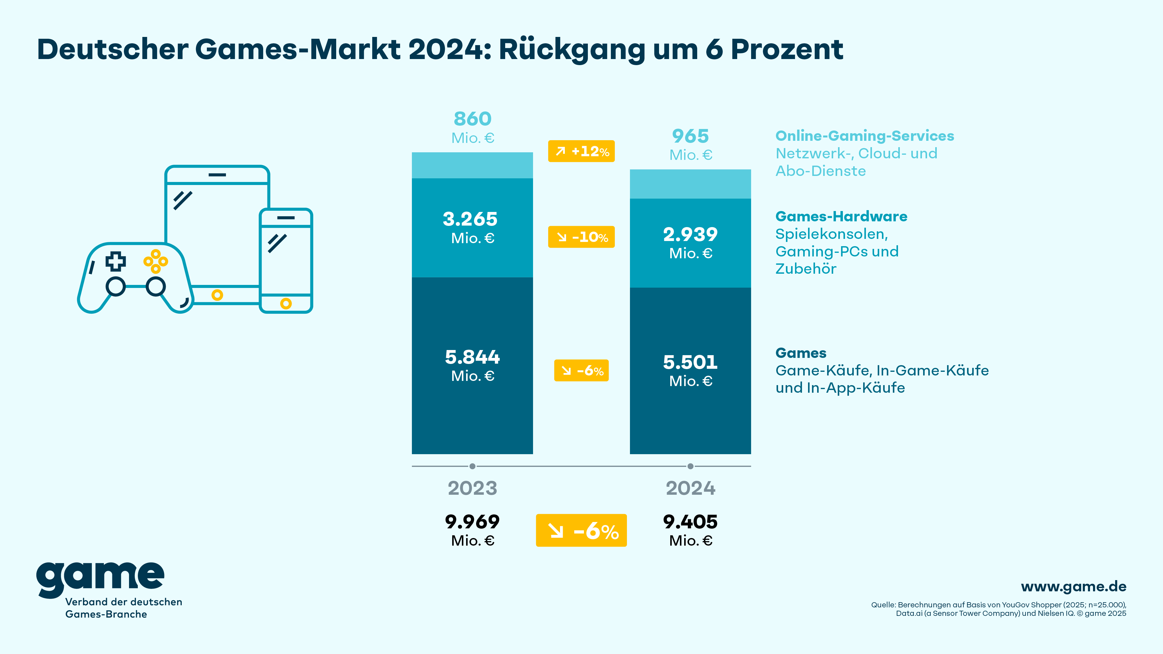 Nachdem der deutsche Games-Markt in den vergangenen Jahren eine ganz neue Größe erreicht hatte – allein seit 2019 ist der Umsatz um über 50 Prozent gewachsen – legte er 2024 eine Wachstumspause ein. Insgesamt wurden im vergangenen Jahr in Deutschland mit Games, Spiele-Hardware und Online-Gaming-Services 9,4 Milliarden Euro umgesetzt.