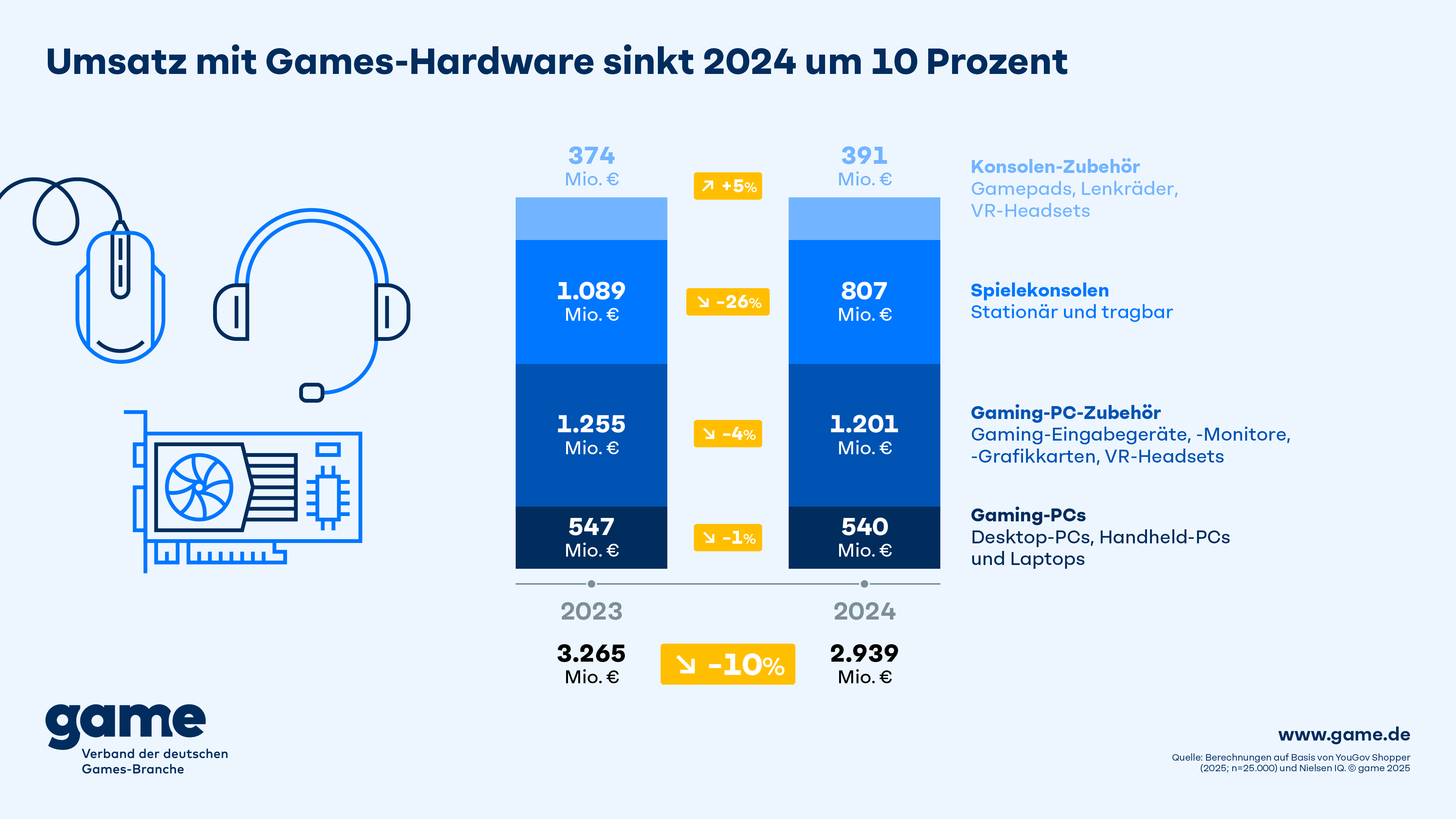 Der Umsatz mit Spiele-Hardware ist 2024 insgesamt um 10 Prozent auf rund 2,9 Milliarden Euro zurückgegangen. Die einzelnen Segmente haben sich dabei recht unterschiedlich entwickelt. Den größten Rückgang gab es bei Spielekonsolen. Hier wurden 807 Millionen Euro und damit 26 Prozent weniger als noch vor einem Jahr umgesetzt. 2023 war allerdings auch ein besonderes Jahr für Spielekonsolen: Nachdem viele Modelle über Jahre nicht durchgängig im Handel verfügbar waren, waren 2023 alle aktuellen Modelle erstmals dauerhaft verfügbar. Viele Spielerinnen und Spieler griffen daher zu und es kam zu Nachholeffekten. Das wird auch deutlich, wenn man den Umsatz mit Spielekonsolen von 2024 und 2022 vergleicht: Trotz des großen Rückgangs um 26 Prozent lag der Umsatz 2024 immer noch über dem von 2022. Der Umsatz mit Zubehör für Spielekonsolen stieg 2024 sogar auf 391 Millionen Euro. Das entspricht einem Plus von 5 Prozent. Der Markt für Spiele-PCs und -Laptops entwickelte sich recht stabil: Mit ihnen wurden 540 Millionen Euro umgesetzt und damit 1 Prozent weniger als noch 2023. Etwas schlechter sieht die Entwicklung beim Zubehör für Spiele-PCs aus, wozu spezielle Eingabegeräte ebenso gehören wie Grafikkarten und Co.: Hier ging der Umsatz um 4 Prozent auf rund 1,2 Milliarden Euro zurück.