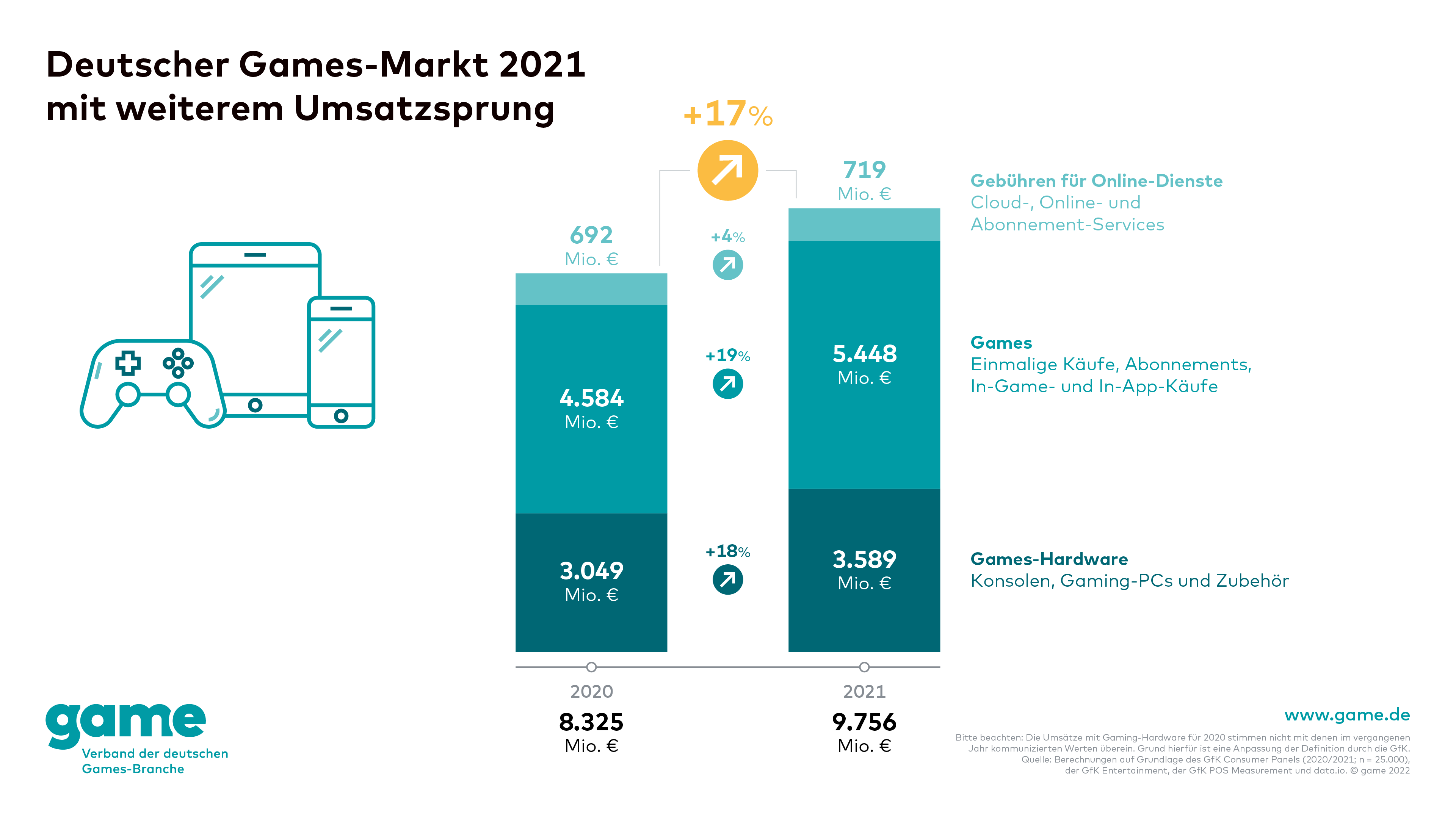 Der deutsche Games-Markt konnte nach dem historischen Wachstumssprung 2020 auch im Folgejahr deutlich zulegen: So wurden 2021 mit Games, Gebühren für Online-Dienste sowie Games-Hardware rund 9,8 Milliarden Euro umgesetzt. Das ist ein Plus von 17 Prozent im Vergleich zum Vorjahr.