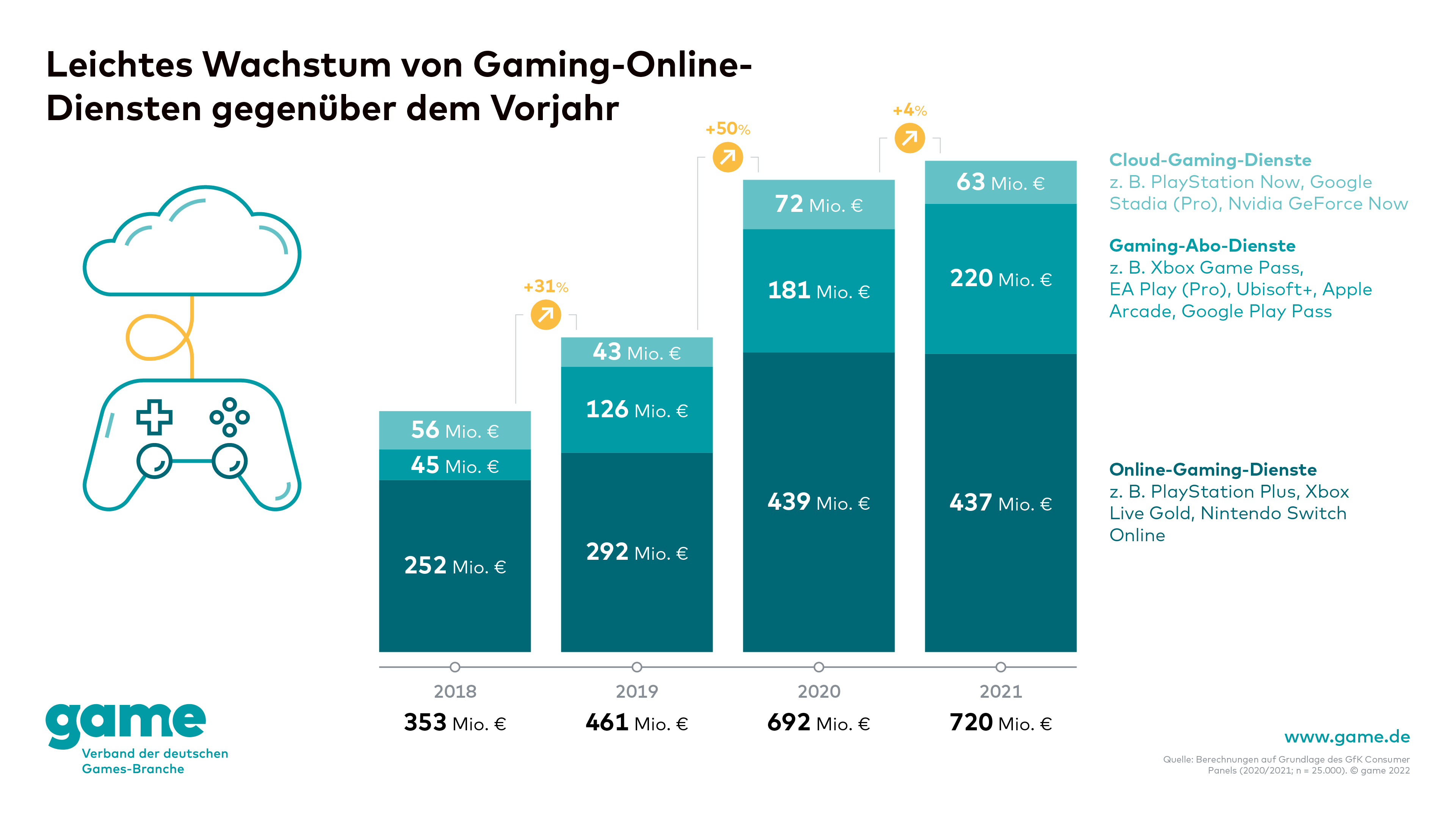 Nach dem großen Wachstumssprung von 50 Prozent 2020 ist der Umsatz mit Gaming-Online-Diensten 2021 um weitere 4 Prozent auf 720 Millionen Euro gestiegen. Entscheidend zu diesem Wachstum haben Gaming-Abo-Dienste wie der Xbox Game Pass, EA Play und Ubisoft+ beigetragen, deren Umsatz um 22 Prozent auf 220 Millionen Euro gestiegen ist. Einen Rückgang um 13 Prozent auf 63 Millionen Euro gab es hingegen bei Cloud-Gaming-Diensten. Einer der Gründe hierfür ist, dass Cloud-Gaming-Funktionen teils kostenfrei in andere Services integriert wurden, so dass kein eigenständiger Umsatz erzielt wird. Auch der Umsatz von Online-Gaming-Diensten ist um 2 Millionen Euro auf 437 Millionen Euro gesunken. Diese werden häufig zu den verschiedenen Spielekonsolen angeboten und umfassen – je nach Angebot – kostenfreie monatliche Spiele, Games-Rabatte, die Möglichkeit Online zu spielen oder auch Cloud-Speicher für Spielstände.