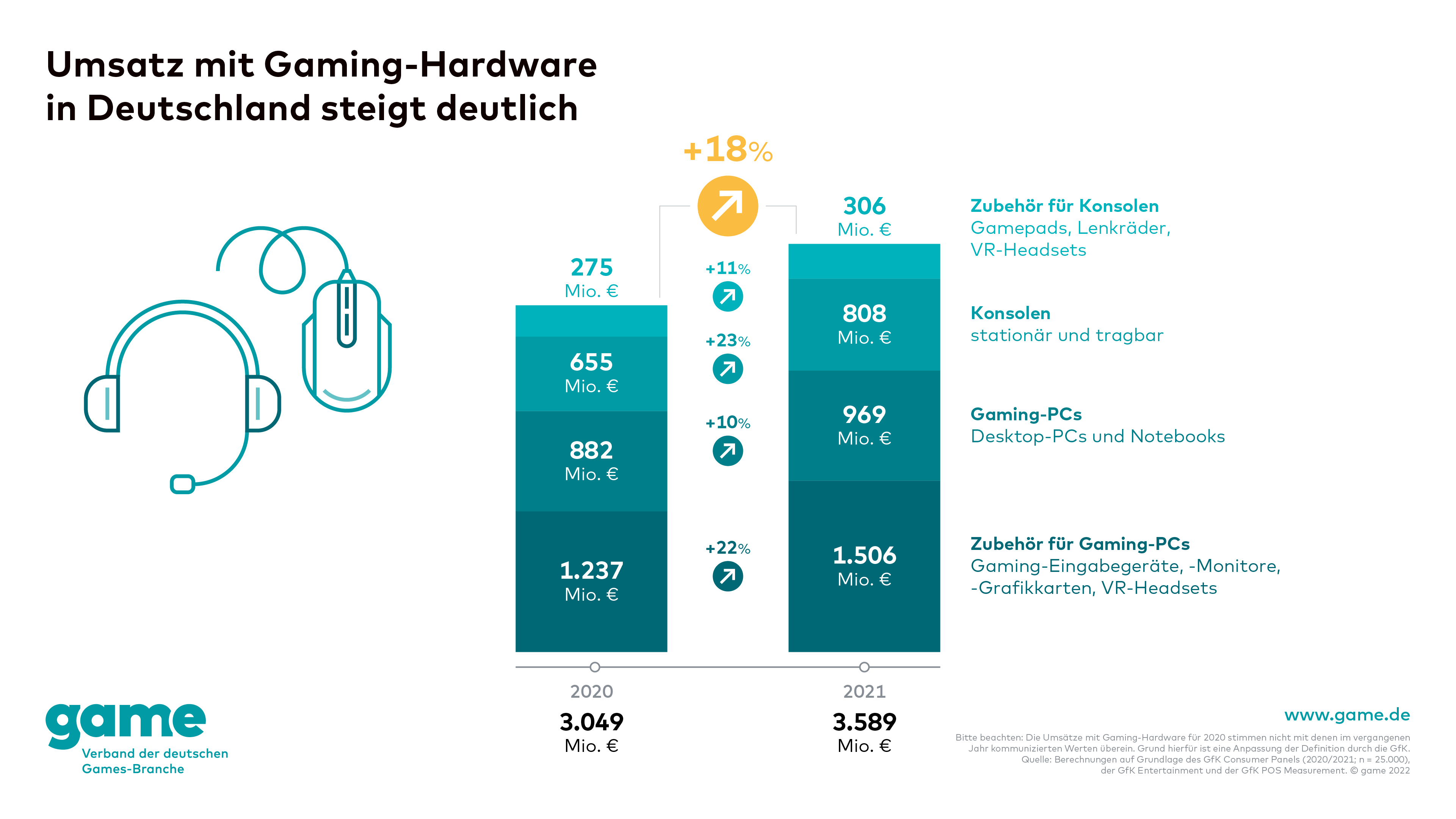 Der Umsatz mit Gaming-Hardware ist insgesamt um 18 Prozent auf rund 3,6 Milliarden Euro gestiegen. Besonders stark nachgefragt sind Spielekonsolen: Obwohl manche Modelle im Handel häufig vergriffen waren, stieg der Umsatz dennoch um 23 Prozent auf 808 Millionen Euro. Rund 1 Milliarde Euro wurde mit Spiele-PCs – Desktops und Laptops – umgesetzt. Das ist ein Plus von 10 Prozent im Vergleich zum Vorjahr. Immer mehr Spielerinnen und Spieler investieren zudem in Zubehör, mit dem sich das Spielerlebnis weiter verbessern lässt. Besonders stark nachgefragt sind Grafikkarten, Tastaturen und Mäuse sowie Monitore und VR-Headsets für den Gaming-Einsatz. Der Umsatz mit Gaming-PC-Zubehör stieg um 22 Prozent auf rund 1,5 Milliarden Euro. Um 11 Prozent auf 306 Millionen Euro legte der Umsatz mit Zubehör für Spielekonsolen zu.