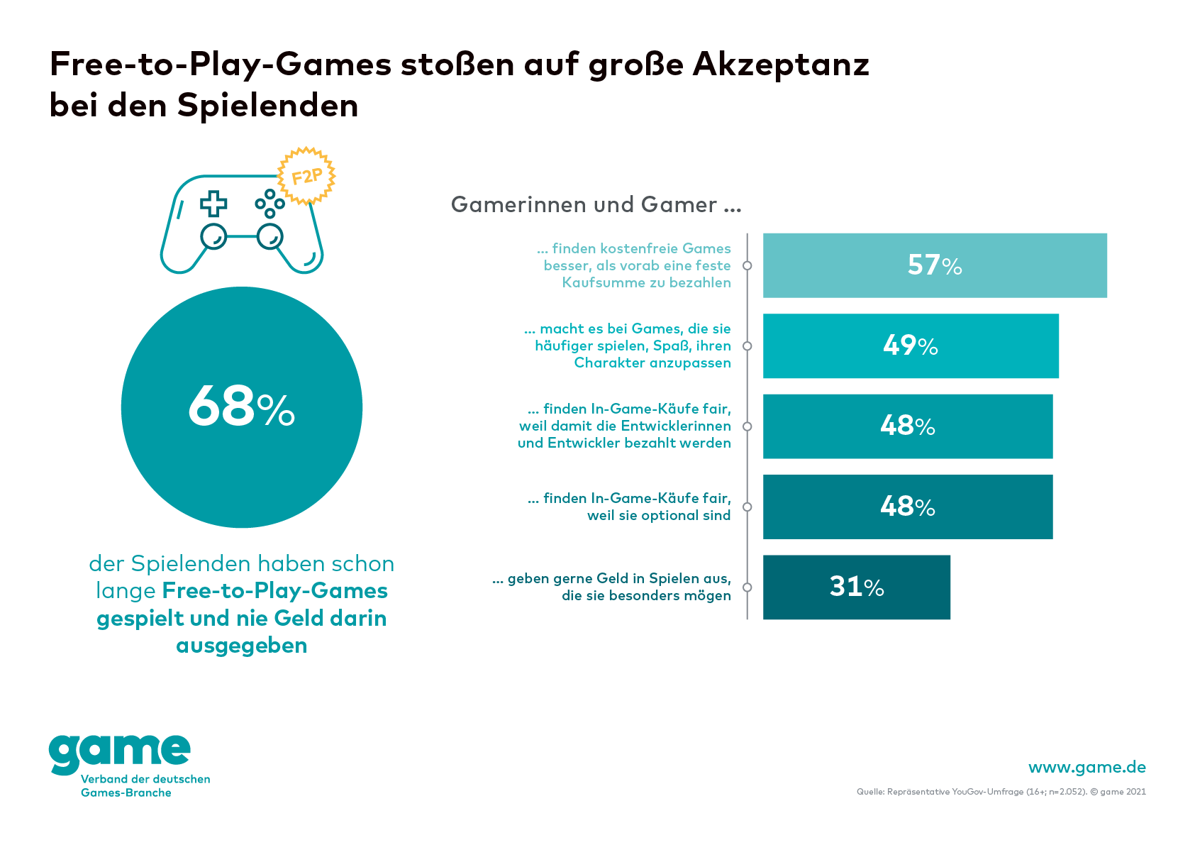 Noch nie zuvor waren so viele Games wie heute für so wenig Geld spielbar. Diese Entwicklung greift die gamescom mit dem Trend "Mehr Games für weniger Geld auf“. Neben dem wachsenden Angebot an immer umfangreicheren Abo-Diensten, die für wenige Euro im Monat den Zugriff auch auf neueste Blockbuster- und Indie-Spiele ermöglichen, sind insbesondere Free-to-Play-Games einer der Hauptgründe hierfür. Aufgrund der Kostenfreiheit in Verbindung mit den optionalen Zusatzkäufen, erfreuen sich diese Spiele dabei einer großen Akzeptanz bei Gamerinnen und Gamern. So haben schon rund zwei Drittel aller Spielenden in Deutschland lange Free-to-Play-Games gespielt, ohne dafür Geld auszugeben. Knapp 6 von 10 Spielerinnen und Spieler finden entsprechende Games besser, als vorab eine feste Kaufsumme zahlen zu müssen. Rund jeder zweite Spielende findet In-Game-Käufe, mit denen sich Free-to-Play-Spiele finanzieren, fair, weil sie optional sind und weil damit die Entwicklung der Spiele bezahlt wird.