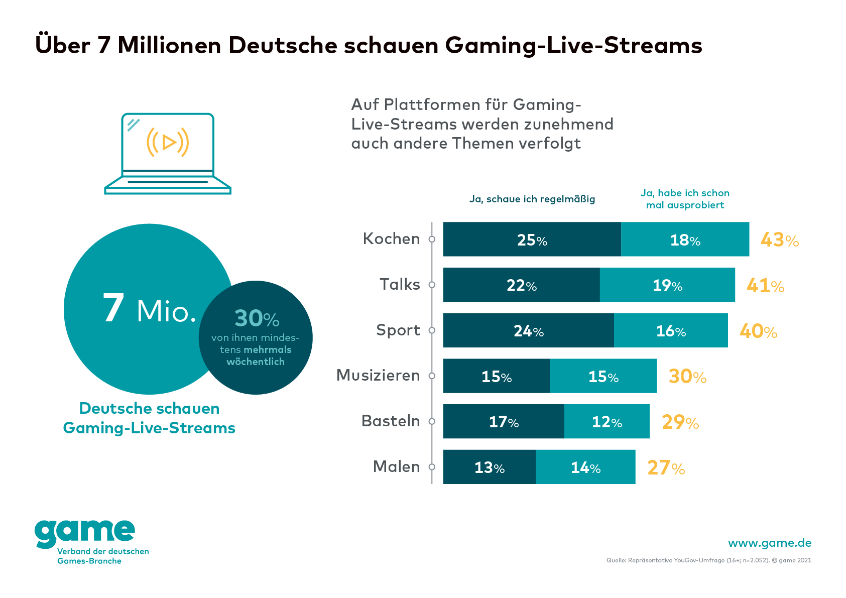 Mit dem Trend "Live-Streaming“ verweist die gamescom in diesem Jahr auf ein Phänomen der Games-Kultur, das in den vergangenen Jahren so stark gewachsen ist wie kaum ein anderes. Live-Übertragungen auf Plattformen wie Twitch, YouTube oder Facebook Gaming, bei denen die Community aktiv einbezogen wird, sind längst zum Lagerfeuer der digitalen Zeit geworden. Über 7 Millionen Menschen in Deutschland nutzen entsprechende Plattformen für Gaming-Live-Streams, rund jeder dritte von ihnen mindestens mehrmals in der Woche. Dabei erfreuen sich auf den Plattformen neben Gaming längst auch viele andere Themen großer Beliebtheit wie Kochen, Talk-Formate oder Sport-Events. Das Besondere an den Live-Streams auf diesen Plattformen ist der unmittelbare Austausch zwischen Creator und Community, deren Zusammenspiel der unterhaltende Faktor ist. Auch die gamescom setzt auf Live-Streaming, etwa mit Shows wie der gamescom: Opening Night Live oder gamescom: Awesome Indies sowie Talk-Formaten wie dem gamescom studio sowie den Live-Streams zahlreicher Partner, die damit weltweit Millionen Fans begeistern.