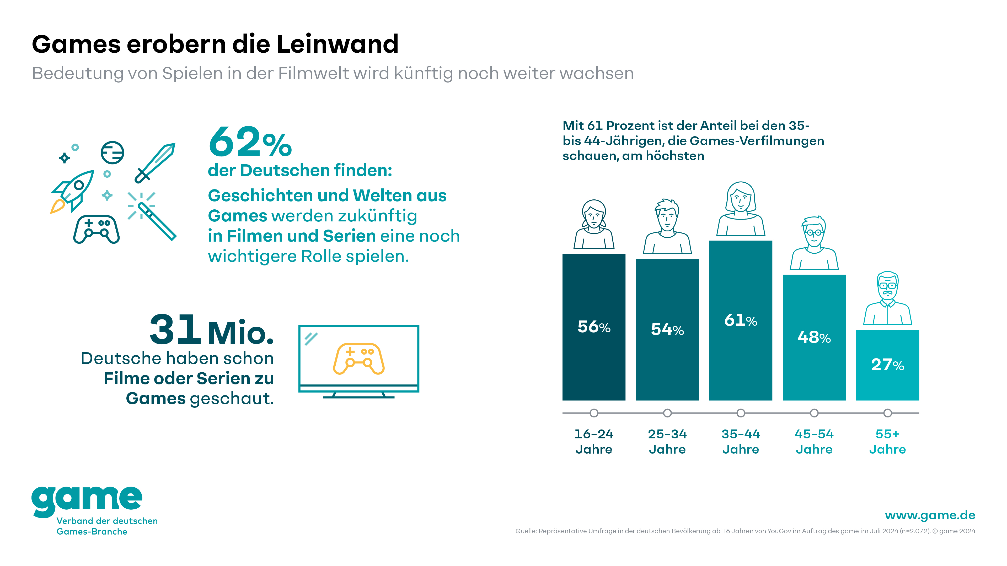 Dabei sieht die Mehrheit der Deutschen in Zukunft eine noch weiter wachsende Bedeutung von Games in der Filmwelt. So sagen fast zwei Drittel der Menschen hierzulande (62 Prozent), dass Geschichten und Welten aus Games zukünftig in Filmen und Serien eine immer wichtigere Rolle spielen werden. Das hat eine Umfrage des game – Verband der deutschen Games-Branche in Zusammenarbeit mit dem Markforschungsinstitut YouGov bestätigt.
