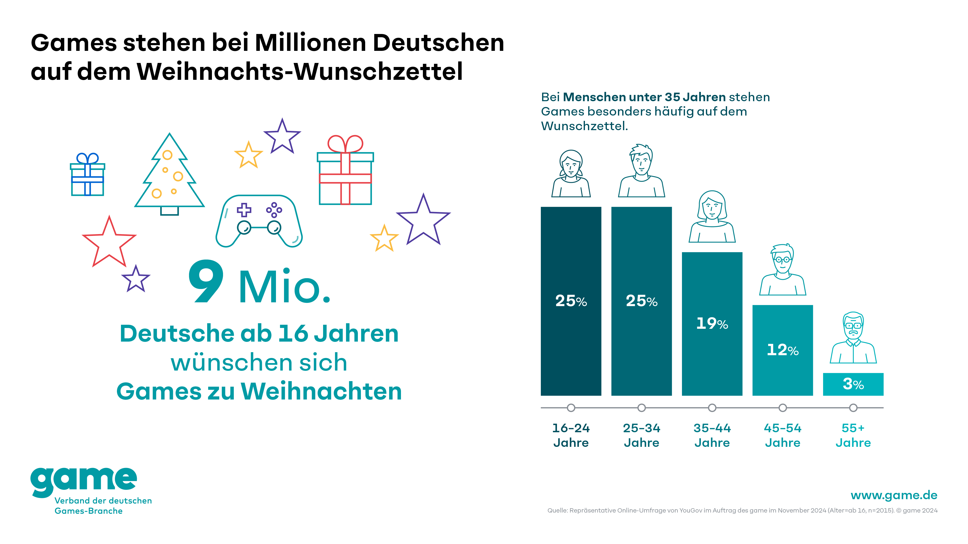 Das ergab eine repräsentative Umfrage des game – Verband der deutschen Games-Branche in Zusammenarbeit mit dem Marktforschungsunternehmen YouGov. Besonders nachgefragt sind Games bei den Jüngeren: So würde sich jede beziehungsweise jeder Vierte unter den 16- bis 24-Jährigen und ebenso viele unter den 25- bis 34-Jährigen (25 Prozent) zu Weihnachten über Spiele freuen.