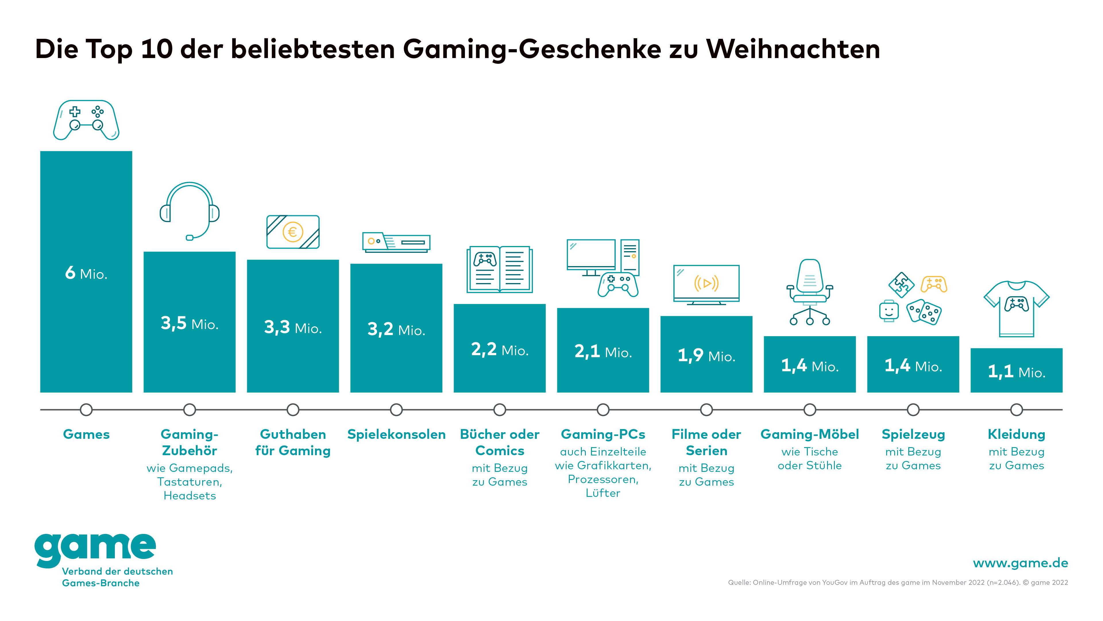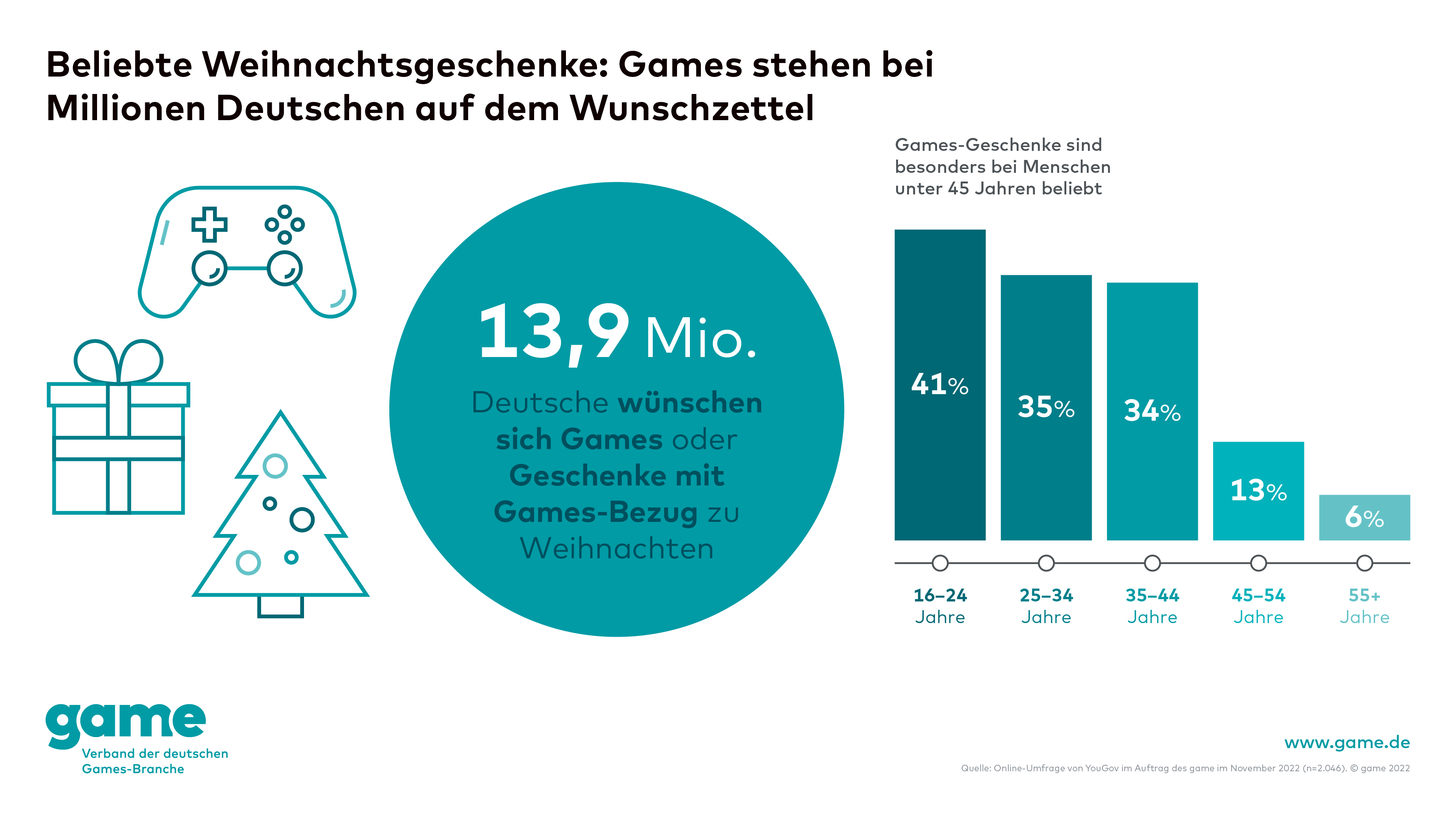 All I want for Christmas… sind Games! In diesem Jahr stehen Computer- und Videospiele sowie Produkte, die auf Games-Marken basieren, auf Weihnachts-Wunschzetteln von Millionen Menschen hierzulande: Rund 13,9 Millionen Deutsche wünschen sich zu Weihnachten Spiele, Gaming-Zubehör, Guthaben für Games und Games-Services, Spielekonsolen und sogar Comics, Bücher oder Filme mit Games-Bezug.