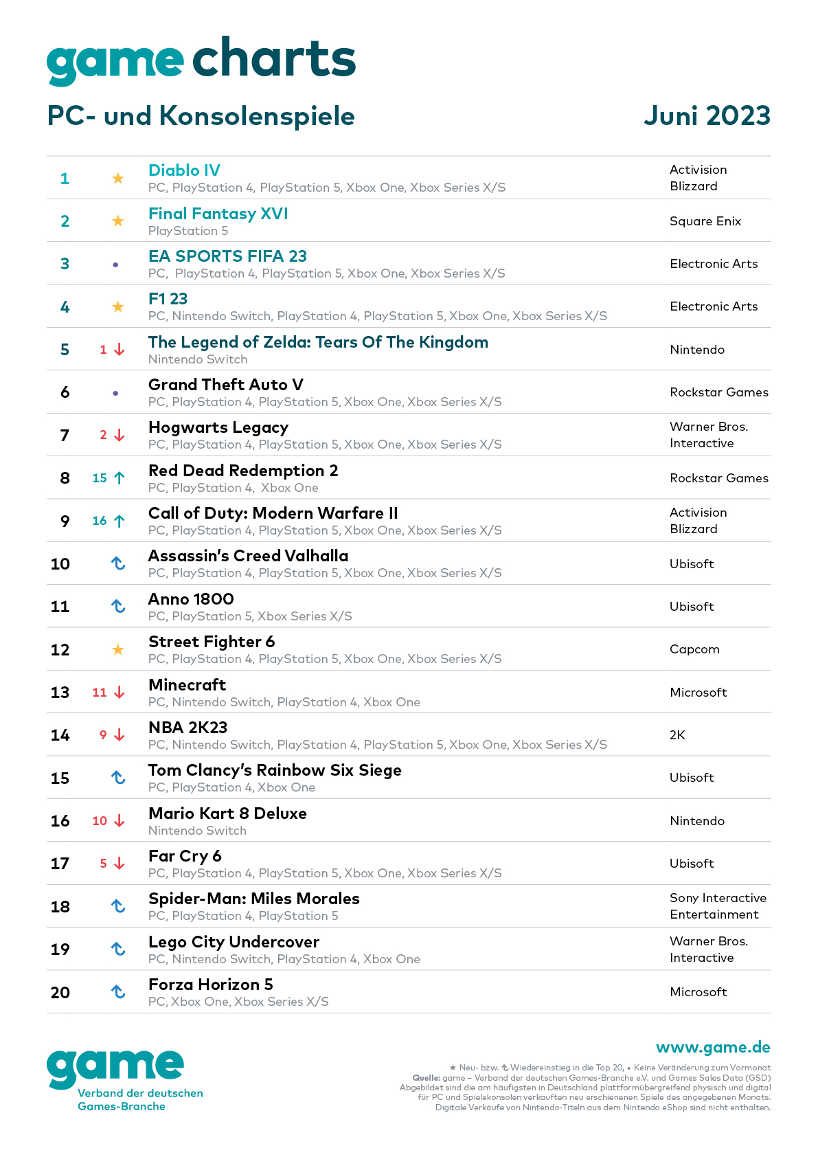 Neben Dämonen bekämpfen und alptraumhafte Dungeons erkunden, freuten sich Spielende im Juni über ein weiteres actiongeladenes Abenteuer – die Fortsetzung der gleichnamigen Spielereihe „Final Fantasy XVI“ (Square Enix), die erst im Juni erschien und auf dem zweiten Platz der deutschen Charts landet. Die ebenfalls im vergangenen Monat neu erschienene Simulation der Formel-1-Weltmeisterschaft 2023 "F1 23" (Electronic Arts) belegt den vierten Platz und landet somit gleich hinter dem Sportspiel-Hit "EA SPORTS FIFA 23" (Electronic Arts) auf Platz 3. Mit dem Kampfspiel „Street Fighter 6“ (Capcom) schafft es außerdem eine weitere Neuerscheinung in die Charts auf Platz 12. Der Vormonatserste "The Legend of Zelda: Tears of the Kingdom" (Nintendo) bleibt in den Top 5 auf dem fünften Platz.