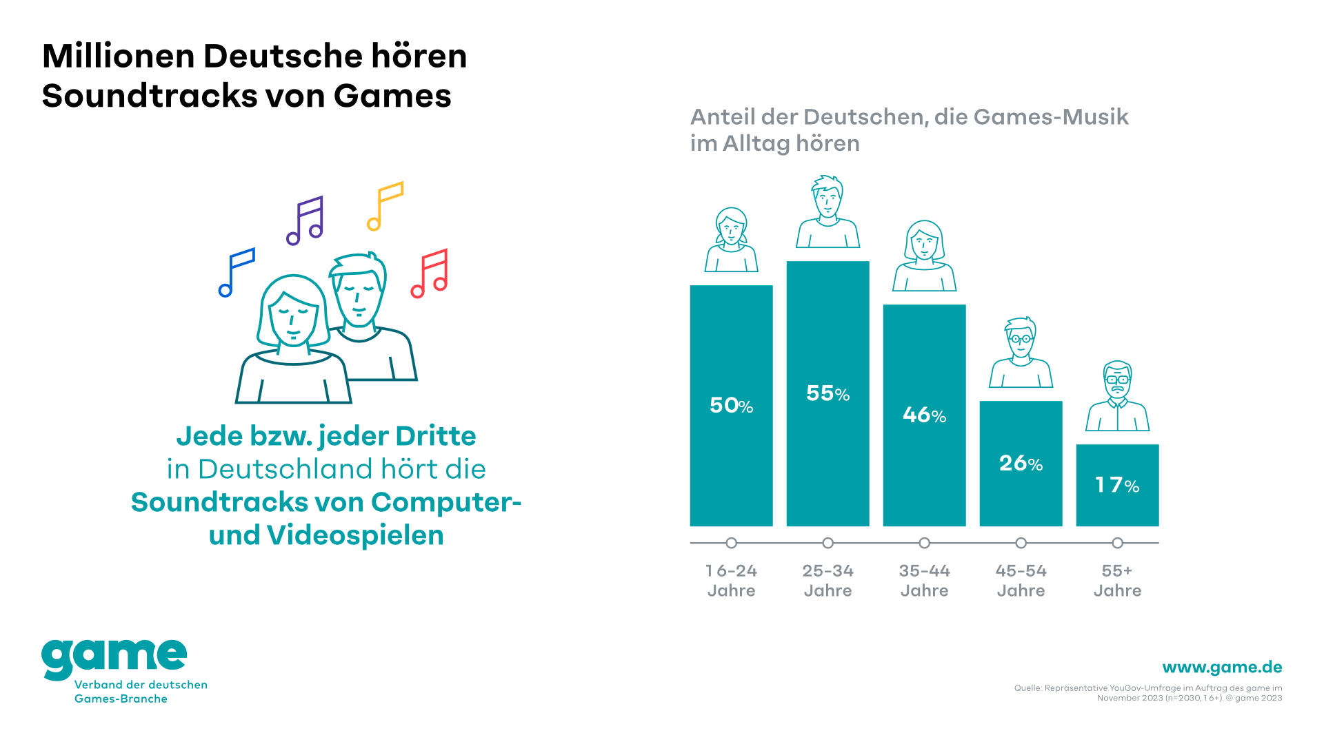 Die unvergessliche Akustikgitarre in "The Last of Us", der legendäre Score von „Final Fantasy“ passend zur epischen Geschichte oder die geheimnisvollen Klänge von "Assassin’s Creed": Das sind nur einige der erstklassigen und unverwechselbaren Soundtracks von Computer- und Videospielen, die mittlerweile zahlreiche Menschen weit über die Games-Community hinaus begeistern. So hört in Deutschland rund jede beziehungsweise jeder Dritte (32 Prozent) – das entspricht rund 23 Millionen Menschen – die Soundtracks von Games auch im Alltag.