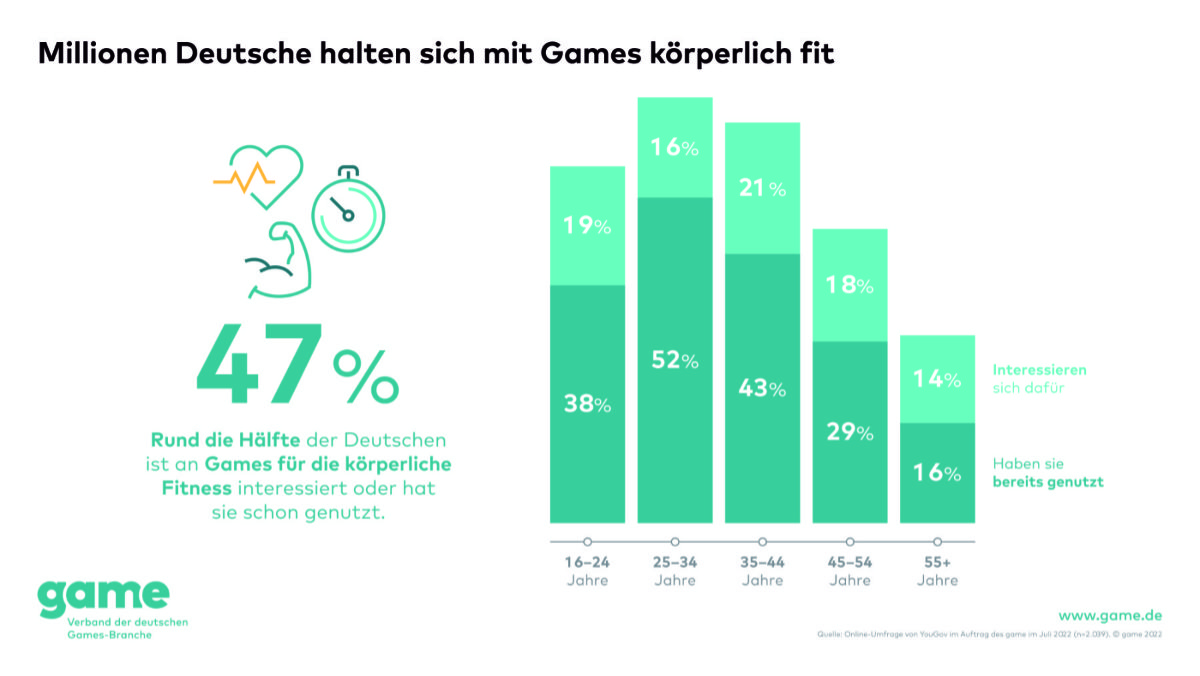 So hat knapp ein Drittel (30 Prozent) schon mal Games gespielt, die die körperliche Fitness unterstützen, und weitere 17 Prozent sind an solchen Spielen interessiert. Das geht aus einer repräsentativen Umfrage des game – Verband der deutschen Games-Branche in Zusammenarbeit mit dem Marktforschungsinstitut YouGov hervor.