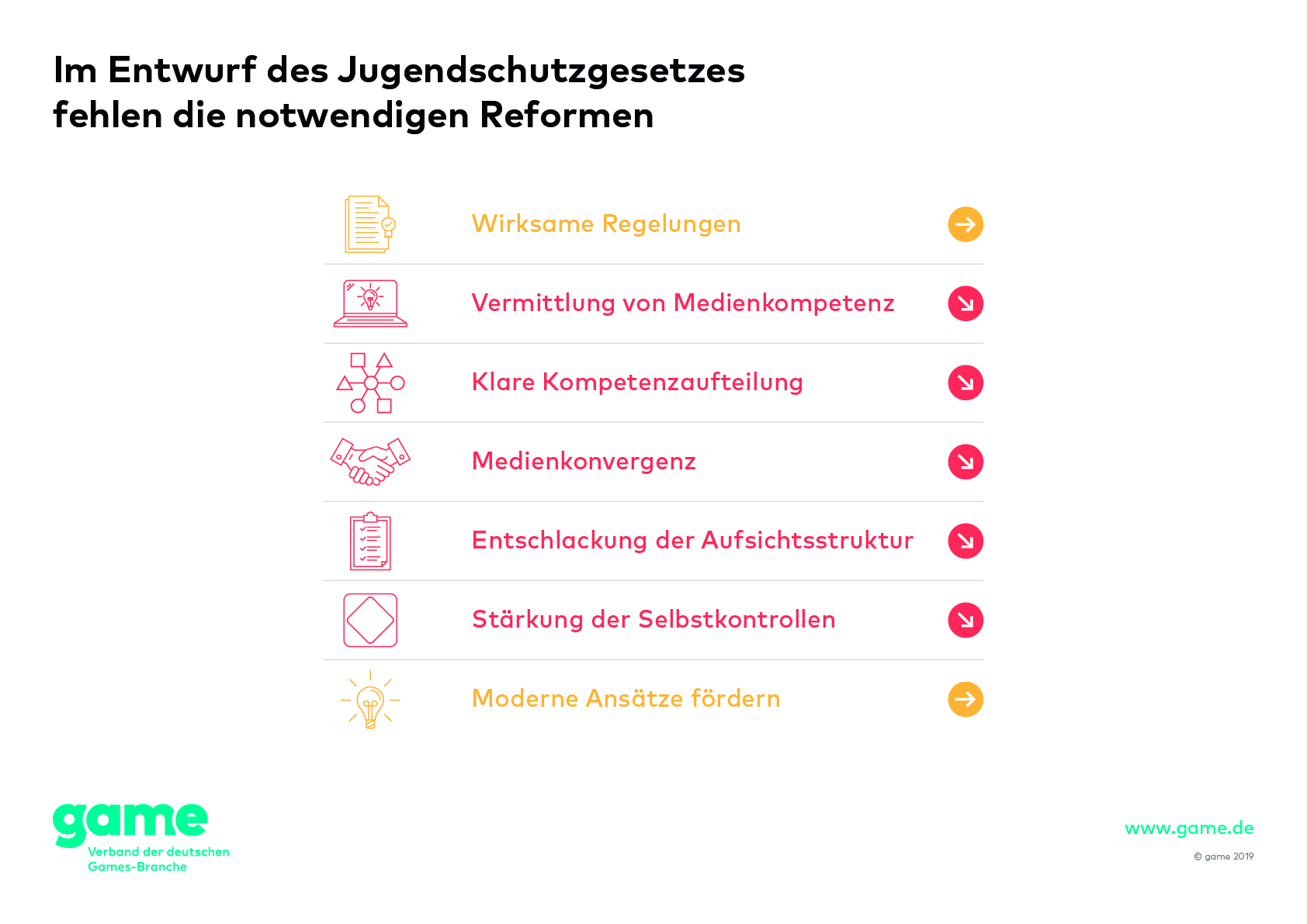 Angesichts des jetzt vorgelegten Entwurfs zieht der game eine weitgehend negative Bilanz. Die sieben MaĂźnahmen fĂĽr einen modernen Jugendschutz in Deutschland, die der game schon seit Langem fordert, wĂĽrden kaum erfĂĽllt: