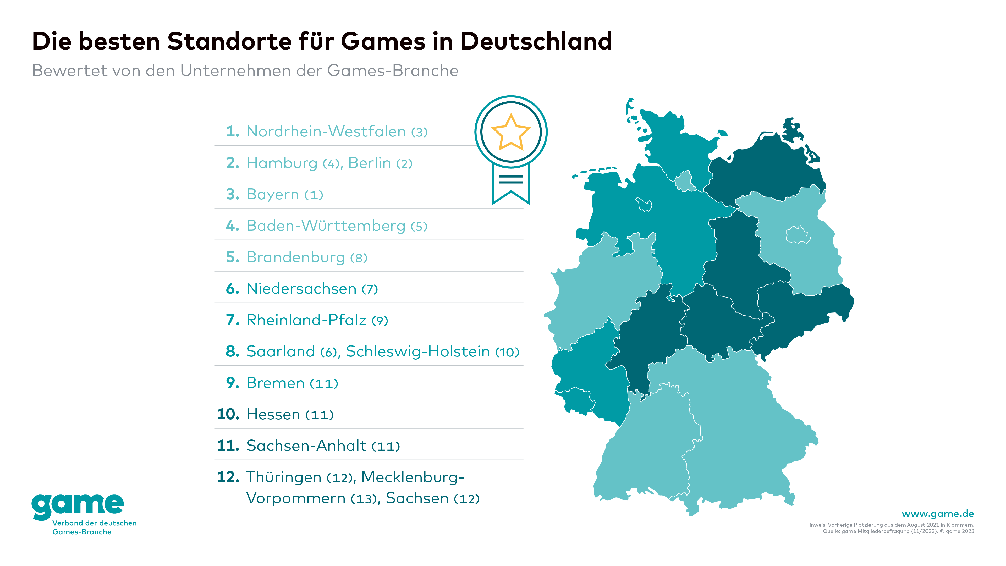 Einen Sprung nach vorne von Platz 4 auf 2 macht zudem Hamburg. Den zweiten Platz teilt sich die Hansestadt mit Berlin, die damit auf dem zweiten Platz bleiben. Bayern, 2021 noch Spitzenreiter, lässt drei Bundesländer an sich vorbeiziehen und landet dieses Mal nur auf dem dritten Platz. In den vergangenen Jahren hatten zahlreiche Bundesländer ihr Engagement für die Games-Branche verstärkt. So wurden regionale Games-Förderungen ausgebaut oder neu eingeführt, Games wurden in Koalitionsverträgen stärker berücksichtigt oder regionale Netzwerke gestärkt, Initiativen für Gründende eingeführt und Standortmarketing betrieben.