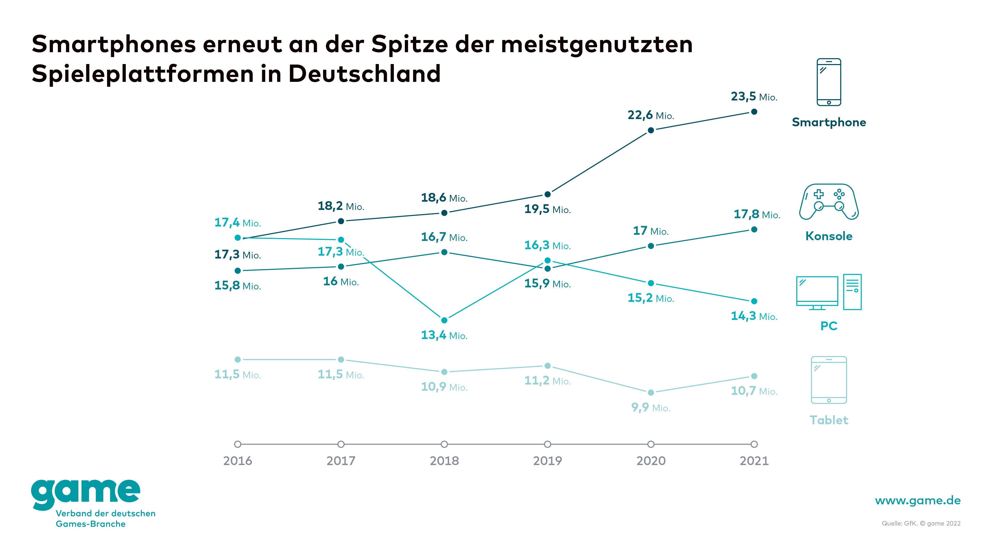 Auf dem Vormarsch sind auch Spielekonsolen, die ihren zweiten Platz als meistgenutzte Plattform aus dem Vorjahr verteidigen: 17,8 Millionen und somit 800.000 mehr Menschen als im Jahr 2020 spielten auf Konsolen. Dass Spielekonsolen derzeit besonders beliebt sind, zeigt unter anderem die Nachfrage nach den aktuellen Modellen wie der Nintendo Switch, der Playstation 5 von Sony oder der Xbox Series X/S von Xbox, die nach wie vor oft größer ist als das Angebot.
