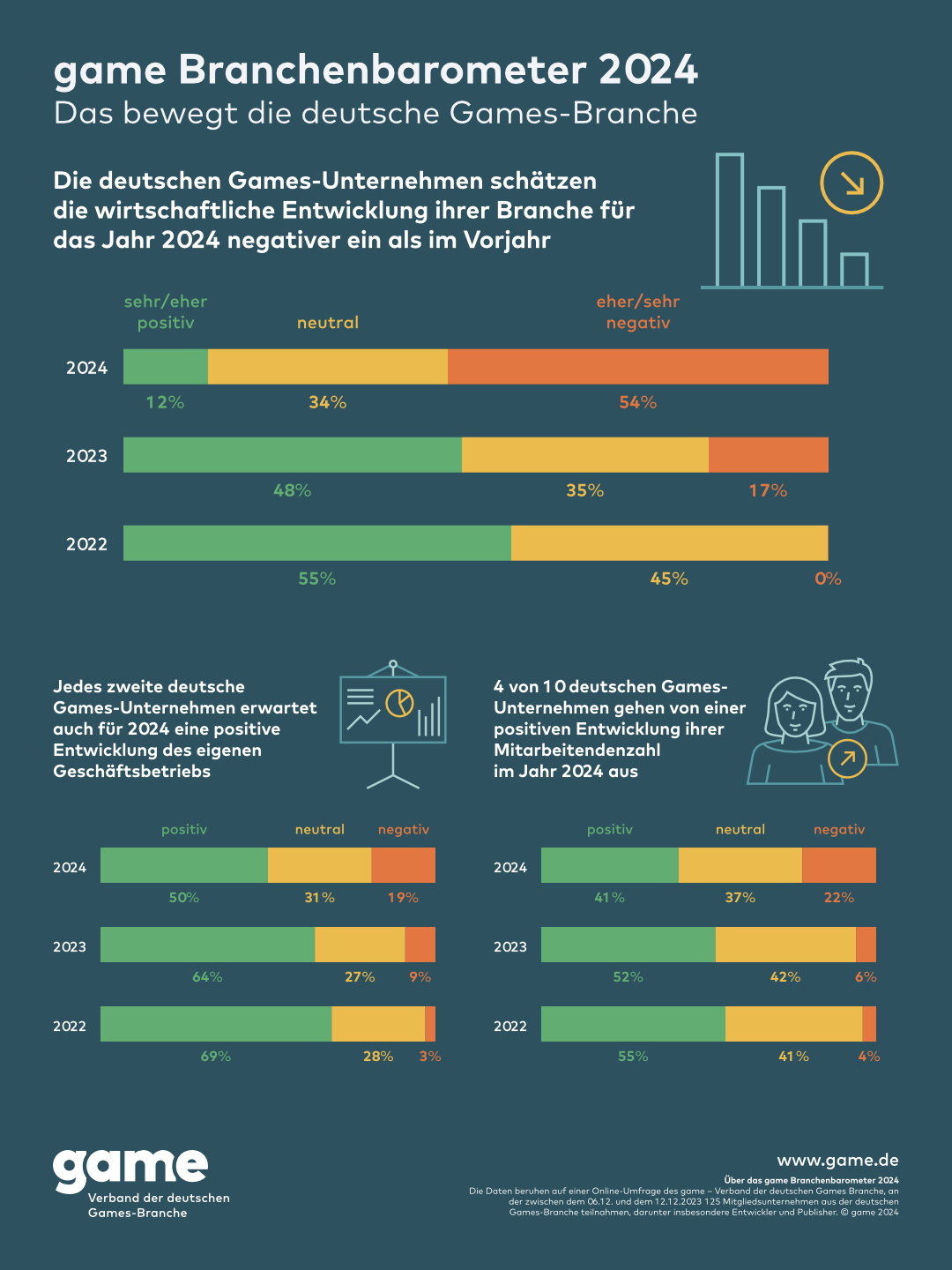 Diese Entwicklungen spiegeln sich nun auch im jährlichen game Branchenbarometer des game – Verband der deutschen Games-Branche wider: Insgesamt bewerten die deutschen Games-Unternehmen den wirtschaftlichen Ausblick für das Jahr 2024 negativer als noch vor einem Jahr: So erwarten nur 12 Prozent der Unternehmen eine sehr positive oder eher positive Entwicklung der deutschen Games-Branche. Zum Vergleich: Vor einem Jahr lag dieser Wert noch bei 48 Prozent. Allerdings sehen die Unternehmen ihre eigene Geschäftsentwicklung deutlich positiver: Jedes zweite Games-Unternehmen (50 Prozent) geht von einer positiven oder eher positiven Entwicklung des eigenen Geschäftsbetriebs aus. Auch die Erwartungen hinsichtlich der Entwicklung der eigenen Mitarbeitendenzahlen sind nicht so negativ wie der Ausblick für die gesamte Branche: 41 Prozent der deutschen Games-Unternehmen gehen von einer positiven oder eher positiven Entwicklung bei der Anzahl ihrer eigenen Mitarbeitenden aus. 37 Prozent erwarten eine neutrale Entwicklung. Nach dem Hin und Her bei der Games-Förderung auf Bundesebene hält sich die Bewertung der Arbeit der Bundesregierung die Waage: Jeweils rund ein Drittel der Unternehmen bewertet die Arbeit als eher positiv (33 Prozent), neutral (31 Prozent) oder eher negativ, beziehungsweise sehr negativ (36 Prozent).