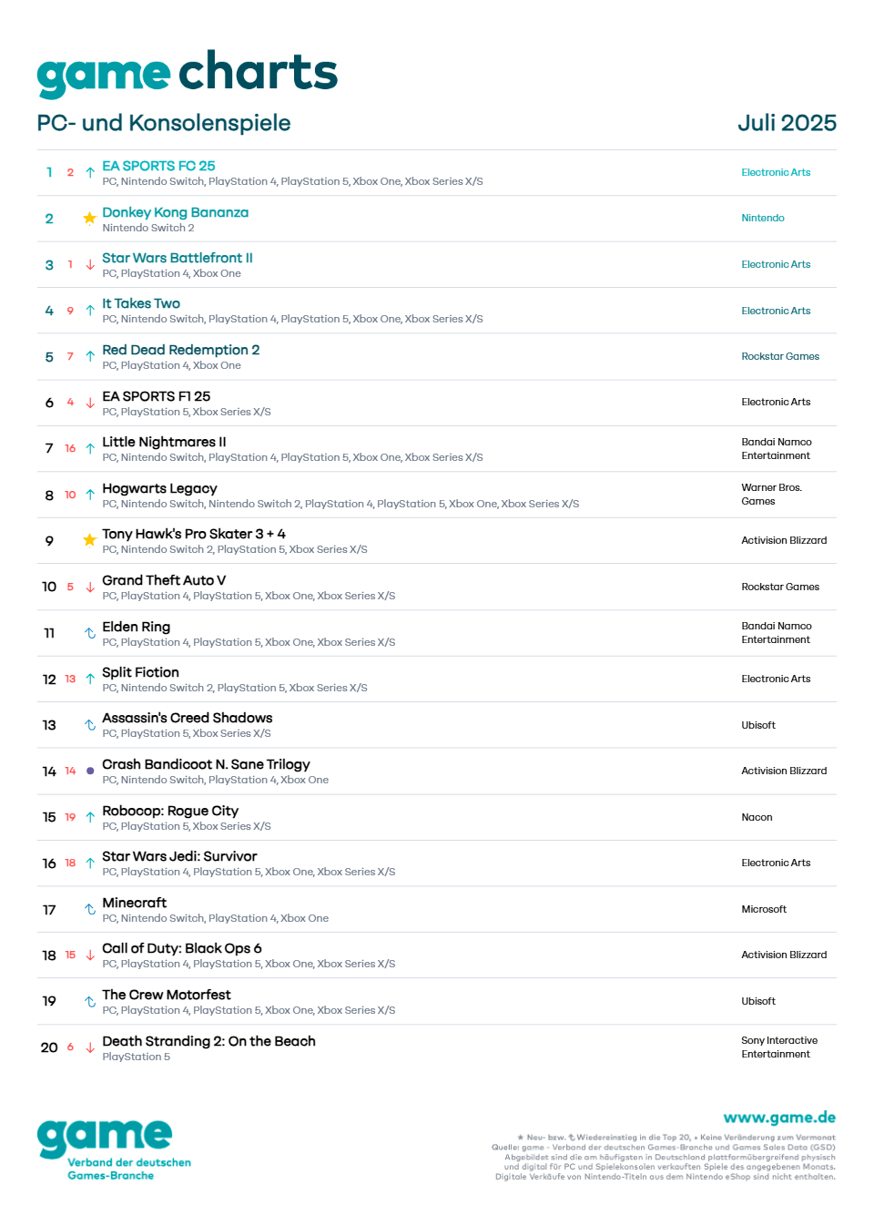 Zwei neue Spiele-Titel schaffen es im Juli in die offiziellen game Charts. "Donkey Kong Bananza" (Nintendo) für die im Mai erschienene Nintendo Switch 2 landet wenige Tage nach seiner Veröffentlichung in den Top 3 und sichert sich gleich den zweiten Platz der meistverkauften PC- und Konsolenspiele in Deutschland.