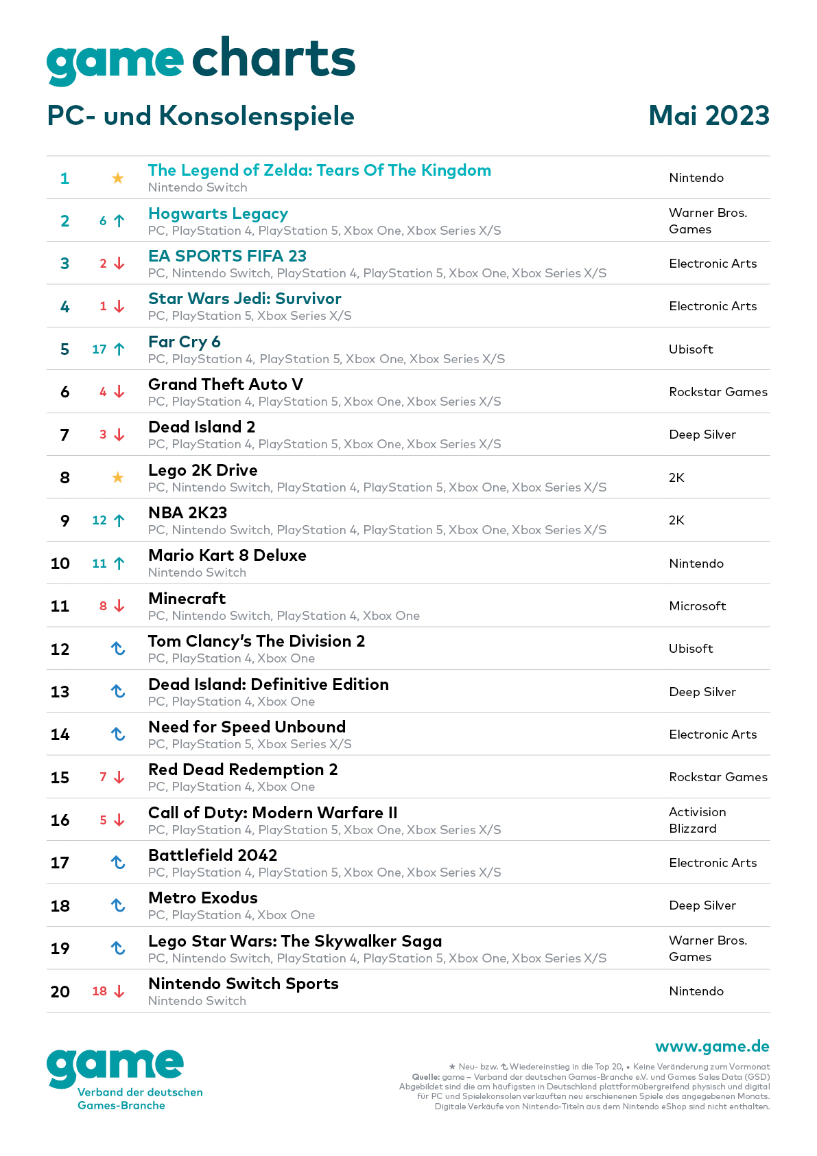 Top 20 der meistgekauften PC- und Konsolenspiele im Mai 2023 in Deutschland: