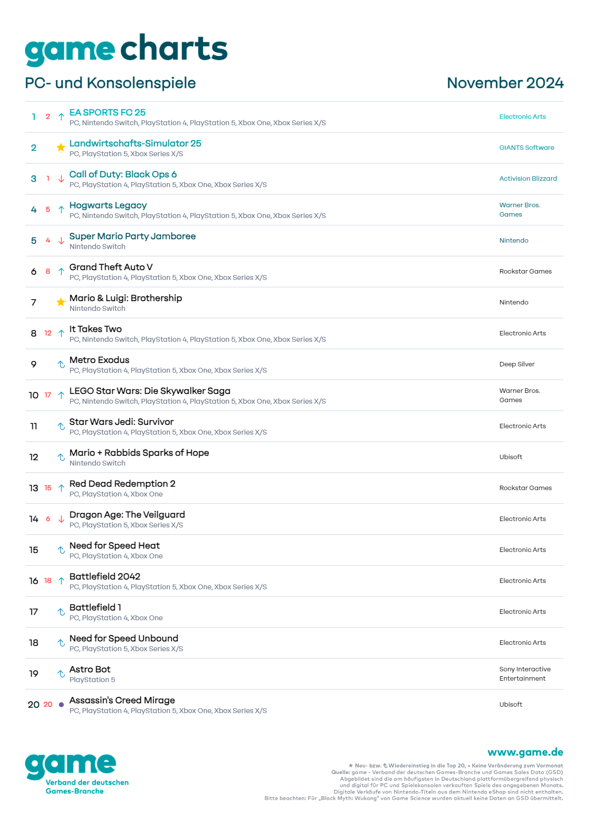 Diesen nimmt im November der "Landwirtschafts-Simulator 25" (GIANTS Software) ein, der höchste Neueinsteiger in diesem Monat. Auf Platz 3 folgt mit "Call of Duty: Black Ops 6" (Activision Blizzard) der Vormonatserste. Ebenfalls ganz neu in den Charts ist "Mario & Luigi: Brothership" (Nintendo) auf Platz 7. Zudem schafften es im November gleich sieben Titel zurück in die Charts: Auf Platz 9 zieht "Metro Exodus" (Deep Silver) wieder in die Top 20 ein, auf Platz 11 folgt "Star Wars Jedi: Survivor" (Electronic Arts) und auf Platz "Mario + Rabbids Sparks of Hope" (Ubisoft). Ebenfalls wieder in den game Charts: "Need for Speed Heat" auf Platz 15, "Battlefield 1" auf Platz 17, "Need for Speed Unbound" auf Platz 18 (alle Electronic Arts) und "Astro Bot" auf Platz 19 (Sony Interactive Entertainment).