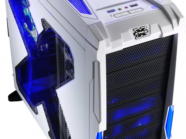 Die Strike-X Advance White Edition sei speziell für Power-User entwickelt und ist fast vollständig weiß gehalten. Jediglich ein paar Elemente sind schwarz hervorgehoben. Den coolen Look bekommt das Gehäuse mit seiner blauen Beleuchtung, welche das ganze arktisch aussehen lässt. Als heutigen Standard besitzt das Strike-X bereits einen USB 3.0 Port.