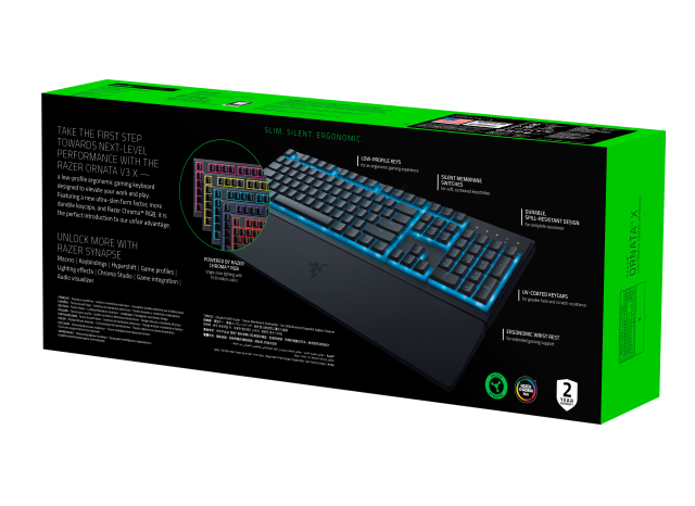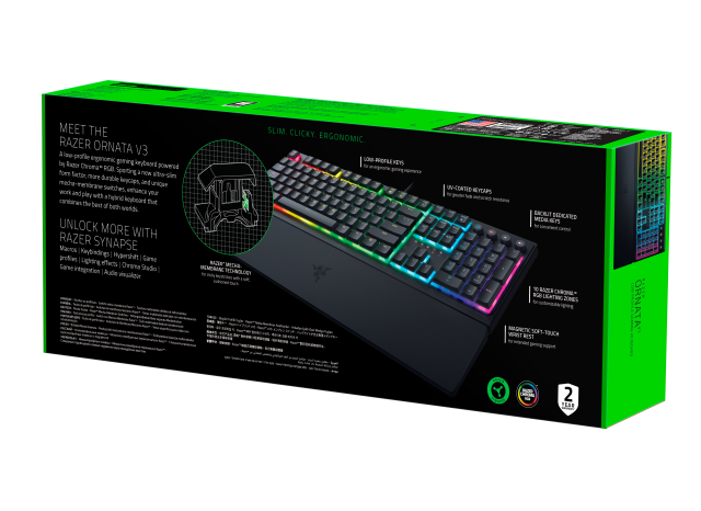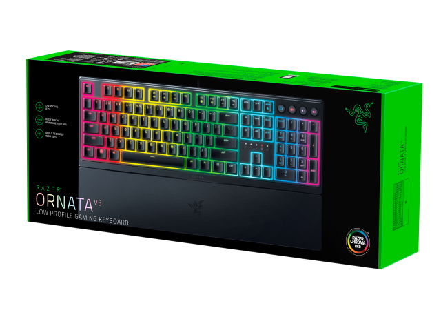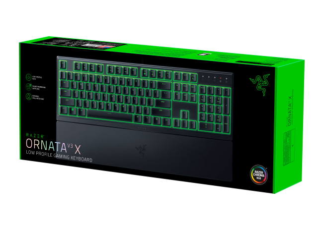 Ebenfalls angekündigt wurde die Ornata V3 X, die den gleichen kompakten, flachen Formfaktor mit langlebigen, UV-beschichteten ABS-Tastenkappen und einem spritzwassergeschützten Design bietet. Die Ornata V3 X verfügt über geräuschlose Membranschalter, Razer Chroma RGB mit 1-Zonen-Beleuchtung und eine abnehmbare Handballenauflage für hohen Gaming-Komfort.