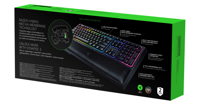 Für lange Spielsessions bietet die Ornata V2 eine weich gepolsterte Handballenauflage, die vorne an der Tastatur magnetisch angeschlossen wird. Dank vollständig programmierbarer Tasten und der Konfiguration über Synapse 3 können Nutzer Makros erstellen, Tasten neu zuweisen und individuelle Profile anlegen. Razer Chroma RGB bietet Beleuchtungseffekte und Ingame-Integration in über 100 Spielen, darunter Apex Legends, Fortnite, Warframe und viele andere.
