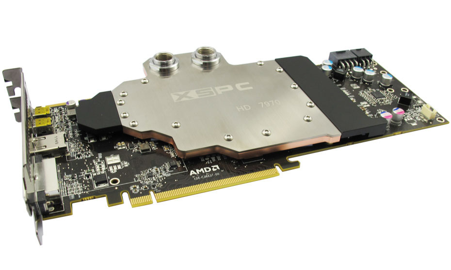Der Kühlkörper ist dabei lediglich einen Slot dick und erreicht alle wichtigen zu kühlenden Komponenten. Hierzu gehören die GPU, die 12 GDDR5-Speicherchips und die Spannungswandler. Der Hauptteil des Kühlkörpers setzt sich aus Kupfer zusammen, während die Fläche bei den Spannungswandlern aus Aluminuim besteht.