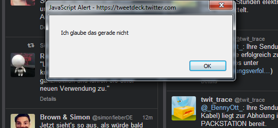 Durch eine oder mehrere XSS-Lücken (Cross Site Scripting), kann es sein, dass eurer TweetDeck seltsame Popups oder Statusmeldungen auf eure Pinnwand postet. Wir haben für euch auch einige Screenshots die dieses beweisen.